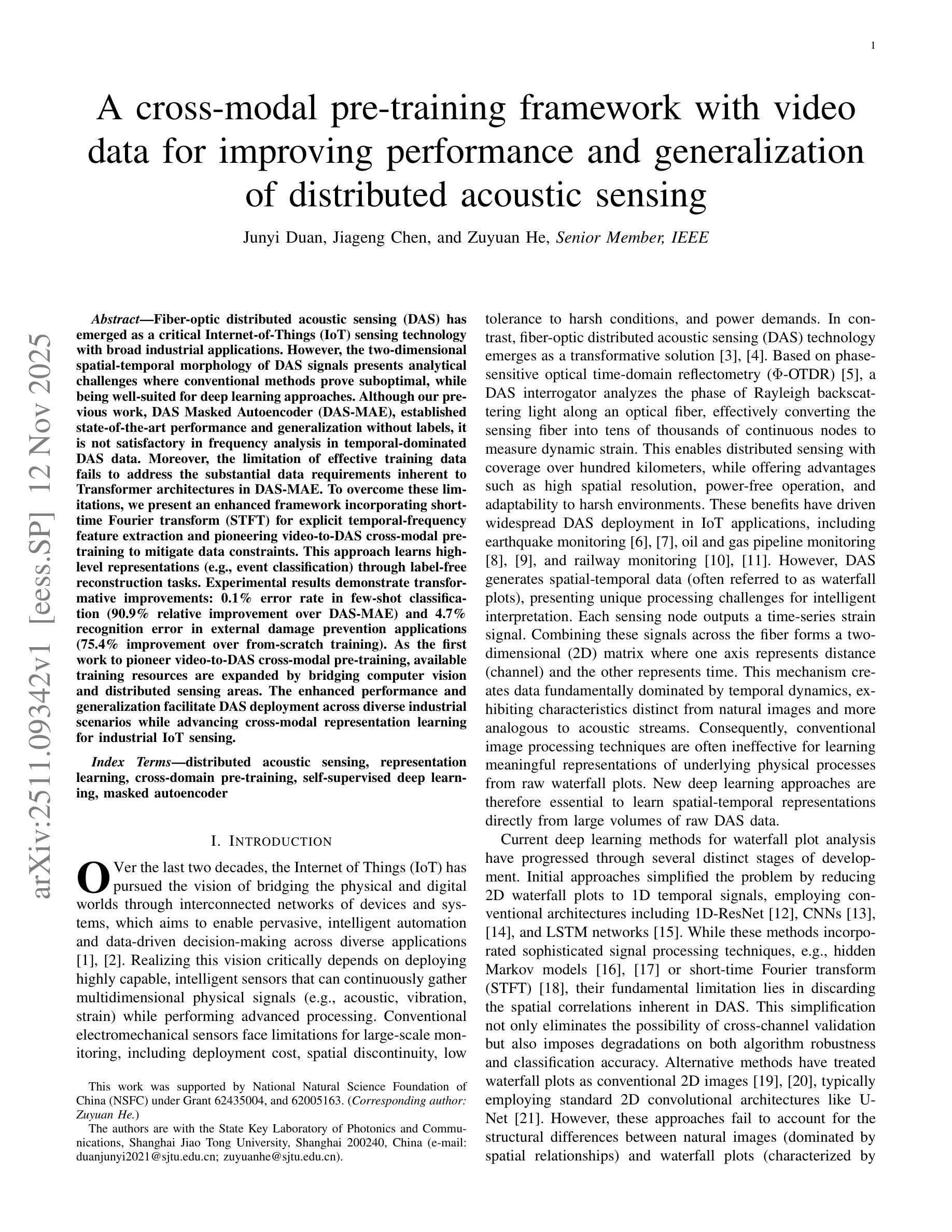 光纤分布式声学感知(DAS)是物联网(IoT)的关键传感技术,广泛应用于工业领域。然而,DAS信号的二维时空形态分析具有挑战性,传统方法效果有限,而深度学习则展现出优势。虽然先前工作DAS Masked Autoencoder(DAS-MAE)在无标签情况下实现了卓越的性能和泛化能力,但在以时间为主的DAS数据的频率分析上仍有不足。此外,受限于有效的训练数据无法满足Transformer架构的数据需求。为克服这些局限,我们提出一个结合短时傅里叶变换(STFT)进行显式时空频率特征提取的增强框架,并开创视频到DAS的跨模态预训练以缓解数据约束。该方法通过无标签重建任务学习高级表示(如事件分类)。实验结果显示出突破性改进:在少样本分类中的错误率为0.1%(相对于DAS-MAE有90.9%的相对改进),在外部损伤预防应用中的识别错误率为4.7%(相对于从头开始训练有75.4%的改进)。作为首次尝试视频到DAS跨模态预训练的工作,我们扩大了可用的训练资源,通过连接计算机视觉和分布式感知领域。增强性能和泛化能力有助于在不同工业场景中部署DAS,同时推动工业物联网感知的跨模态表示学习。