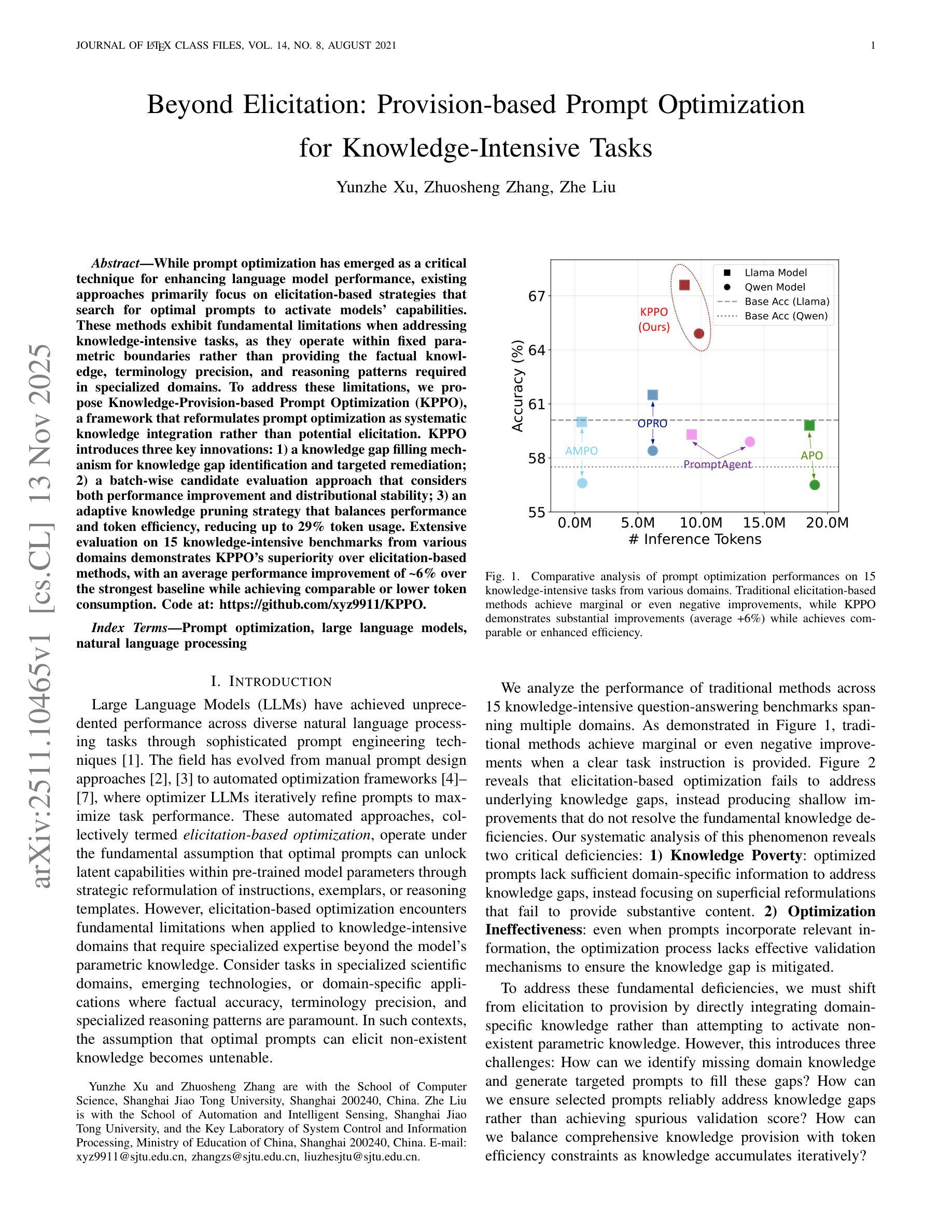 本文提出一种基于知识供给的提示优化(KPPO)框架,以解决现有语言模型在知识密集型任务中的局限性。该框架通过系统整合知识,而非仅依赖潜在提示,引入三项关键技术创新:填补知识差距的机制、批量候选评估方法和自适应知识修剪策略。在多个知识密集型基准测试上的广泛评估表明,KPPO显著优于基于提示的方法,平均性能提高约6%,同时实现较低或相当的令牌消耗。