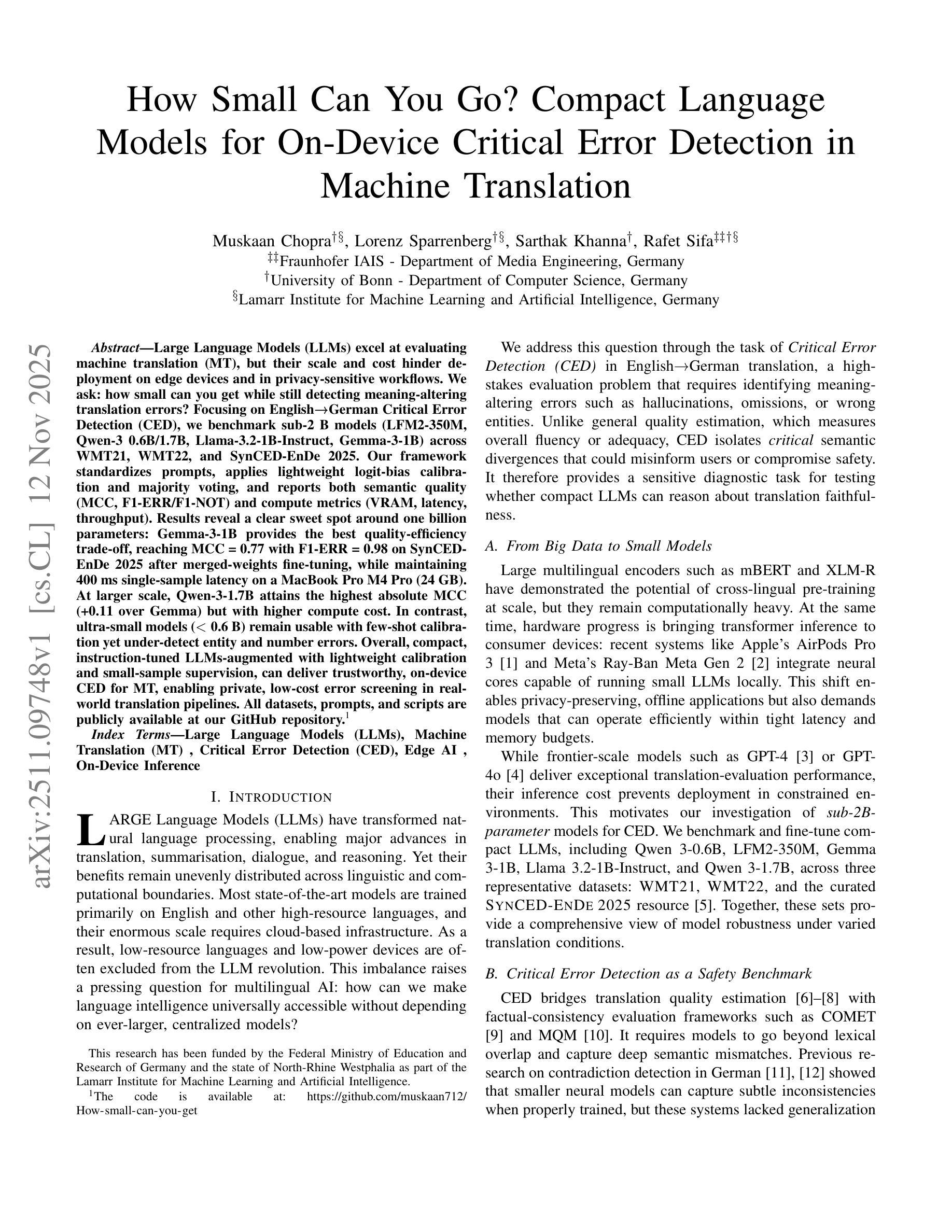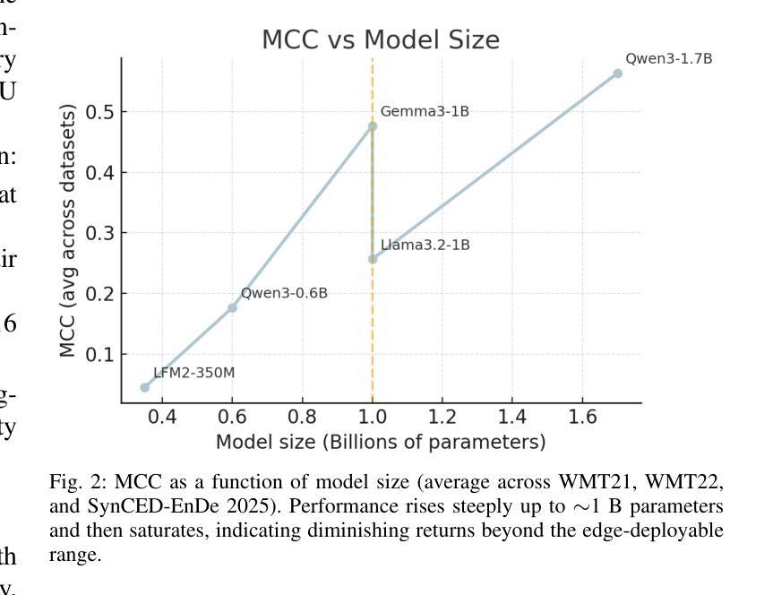 大型语言模型(LLMs)擅长评估机器翻译(MT)的效果,但其规模和成本阻碍了其在边缘设备和隐私敏感工作流程中的部署。我们的问题是:在仍能检测意义改变的翻译错误的情况下,你能做到多小?我们专注于英语到德语的临界错误检测(CED),对sub-2B模型(LFM2-350M、Qwen-3-0.6B/1.7B、Llama-3.2-1B-Instruct、Gemma-3-1B)在WMT21、WMT22和SynCED-EnDe-2025上进行基准测试。我们的框架标准化了提示,应用了轻量级的logit-bias校准和多数投票,并报告了语义质量(MCC、F1-ERR/F1-NOT)和计算指标(VRAM、延迟、吞吐量)。结果揭示了一个明确的甜蜜点,大约十亿参数:Gemma-3-1B在合并权重微调后,在SynCED-EnDe-2025上达到MCC=0.77,F1-ERR=0.98,提供了最佳的质量效率权衡,同时在MacBook Pro M4 Pro(24GB)上保持400毫秒的单样本延迟。在更大规模上,Qwen-3-1.7B达到了最高的绝对MCC值(比Gemma高0.11),但计算成本更高。相比之下,超小型模型(0.6B)在少量校准下仍然可用,但在检测实体和数字错误方面仍存在不足。总体而言,紧凑、指令调整的LLMs辅以轻量级校准和小样本监督,可以实现在线设备上的MT CED可靠检测,从而能够在现实世界的翻译管道中实现私人化、低成本错误筛查。所有数据集、提示和脚本都可在我们的GitHub仓库中找到。