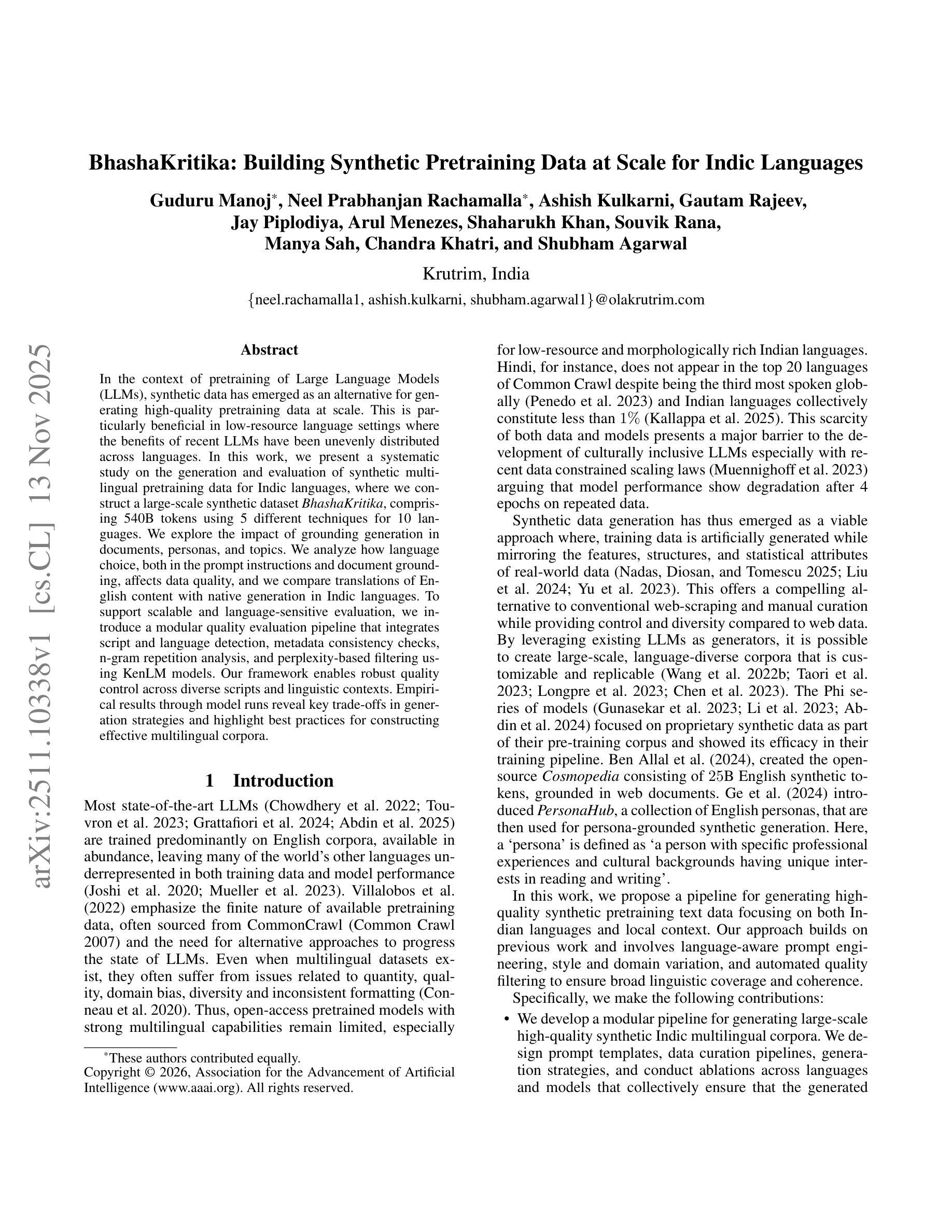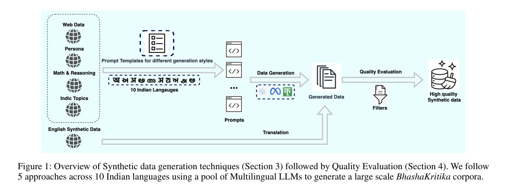 该文介绍了合成数据在预训练大型语言模型(LLM)中的应用,特别是在低资源语言环境下的优势。研究团队针对印度语言生成并评估了大规模合成预训练数据集BhashaKritika,包含540B标记,使用5种技术为10种语言生成。该研究探讨了基于文档、人物和主题的生成影响,分析了指令语言和文档基础的语言选择对数据质量的影响,并比较了英语内容的翻译与印度语言的本地生成。为支持可扩展和语言敏感的评价,研究团队引入模块化质量评估管道,整合脚本和语言检测、元数据一致性检查、n-gram重复分析和基于KenLM模型的困惑度过滤。此框架能够在不同脚本和语言环境下实现稳健的质量控制。实证结果揭示了生成策略的关键权衡,并强调了构建有效多语言语料库的最佳实践。
