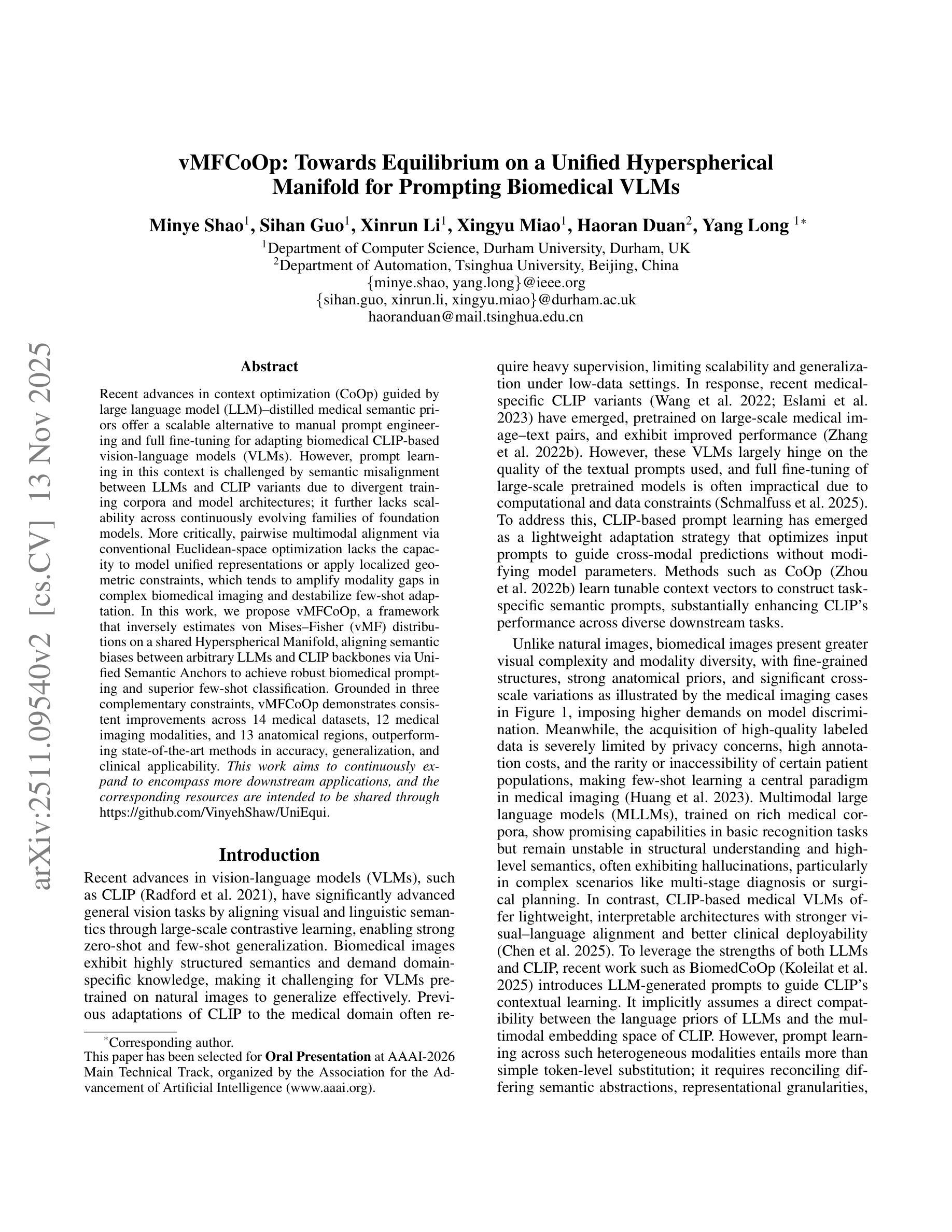 最近,以大型语言模型(LLM)提炼的医疗语义先验知识为指导的上下文优化(CoOp)的进步,为基于CLIP的生物医学视觉语言模型(VLMs)的适应提供了手动提示工程和完全微调的可扩展替代方案。然而,在这种情况下,提示学习面临来自LLM和CLIP变体之间语义不对齐的挑战,这是由于不同的训练语料库和模型架构导致的;它缺乏在不断发展的基础模型家族中的可扩展性。更关键的是,通过传统的欧几里得空间优化进行的成对多模式对齐缺乏建模统一表示或应用局部几何约束的能力,这往往会放大复杂生物医学成像中的模式差距,并破坏少量数据的适应性。在这项工作中,我们提出了vMFCoOp框架,它通过逆向估计共享超球流形上的von Mises-Fisher(vMF)分布,通过统一语义锚对齐任意的LLM和CLIP骨干网,实现稳健的生物医学提示和出色的少量数据分类。基于三个互补的约束,vMFCoOp在14个医疗数据集、12种医疗成像方式和13个解剖区域上显示出持续的一致性改进,在准确性、通用性和临床适用性方面超越了最先进的方法。本工作的目标是不断扩大,涵盖更多的下游应用,相关资源将通过https://github.com/VinyehShaw/UniEqui进行共享。