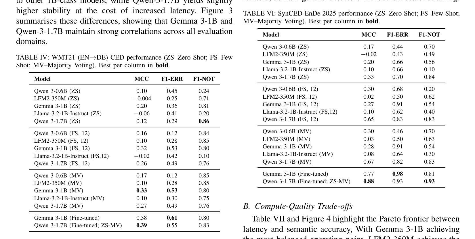 该文本探讨了小型语言模型在机器翻译错误检测方面的能力。通过对比多个子2B模型在多种数据集上的表现,发现围绕十亿参数规模的模型具有最佳的质量效率平衡点。特定模型在合成数据集上达到了较高的语义质量指标,同时在MacBook Pro上的延迟较低。随着模型规模的扩大,虽然性能有所提高,但计算成本也相应增加。而超小型模型虽然可以通过少量样本进行校准,但在检测实体和数字错误方面仍有不足。总体而言,通过轻量级校准和小样本监督增强的紧凑指令调优的小型语言模型可为机器翻译提供可靠的在设备错误检测,适用于现实世界的翻译管道中的私人、低成本错误筛选。