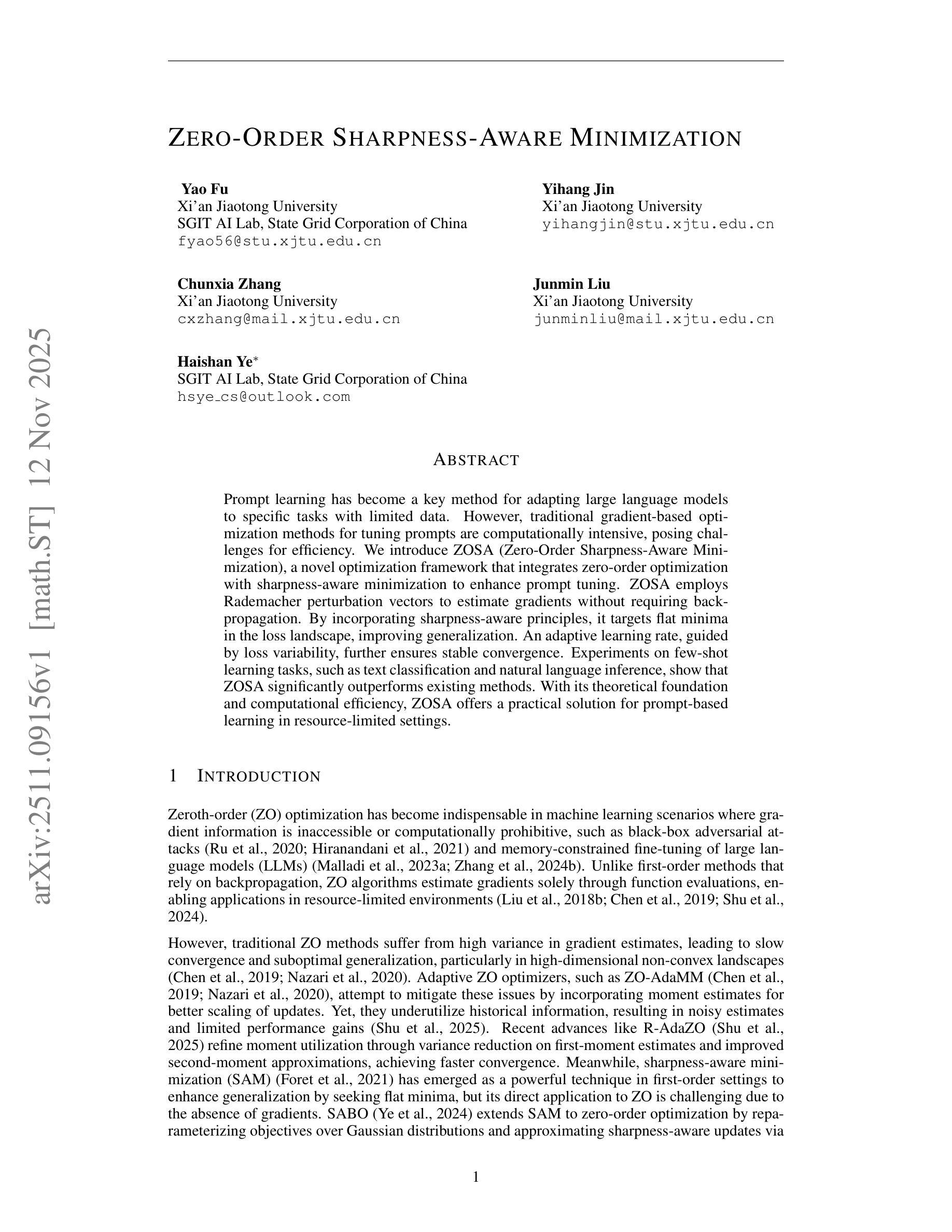 提示学习已成为适应大型语言模型进行特定任务的关键方法,尤其当数据有限时。然而,传统的基于梯度的优化方法在调整提示时计算量大,对效率构成挑战。我们引入了ZOSA(零阶尖锐度感知最小化),这是一种新型优化框架,它将零阶优化与尖锐度感知最小化相结合,以提高提示调整能力。ZOSA使用Rademacher扰动向量来估计梯度,无需反向传播。通过结合尖锐度感知原理,它在损失景观中寻找平坦的最小值,从而提高泛化能力。由损失变化引导的自适应学习率进一步确保稳定的收敛。在文本分类和自然语言推理等小样本学习任务上的实验表明,ZOSA显著优于现有方法。凭借其理论基础和计算效率,ZOSA为资源受限环境下的基于提示的学习提供了实用解决方案。