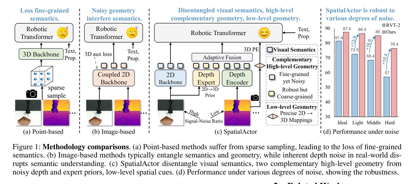 本文提出了一种名为SpatialActor的框架,用于解决机器人在真实世界中进行操作时的语义和几何问题。该框架旨在解决现有方法在处理语义和几何信息时的不足,包括稀疏采样导致的语义丢失、真实世界深度噪声引起的语义和几何纠缠问题,以及忽视低级空间线索的问题。SpatialActor通过自适应融合噪声深度和语义引导先验信息,实现了语义指导的几何模块。此外,它利用低级空间线索进行精确的二维至三维映射,并通过空间变换实现空间特征间的交互。评估结果显示,SpatialActor在模拟和真实世界的多个场景中实现了卓越性能,特别是在不同噪声条件下的任务中表现出强大的鲁棒性。此外,它还能显著提高对新任务的快速适应能力和在各种空间扰动下的稳健性。