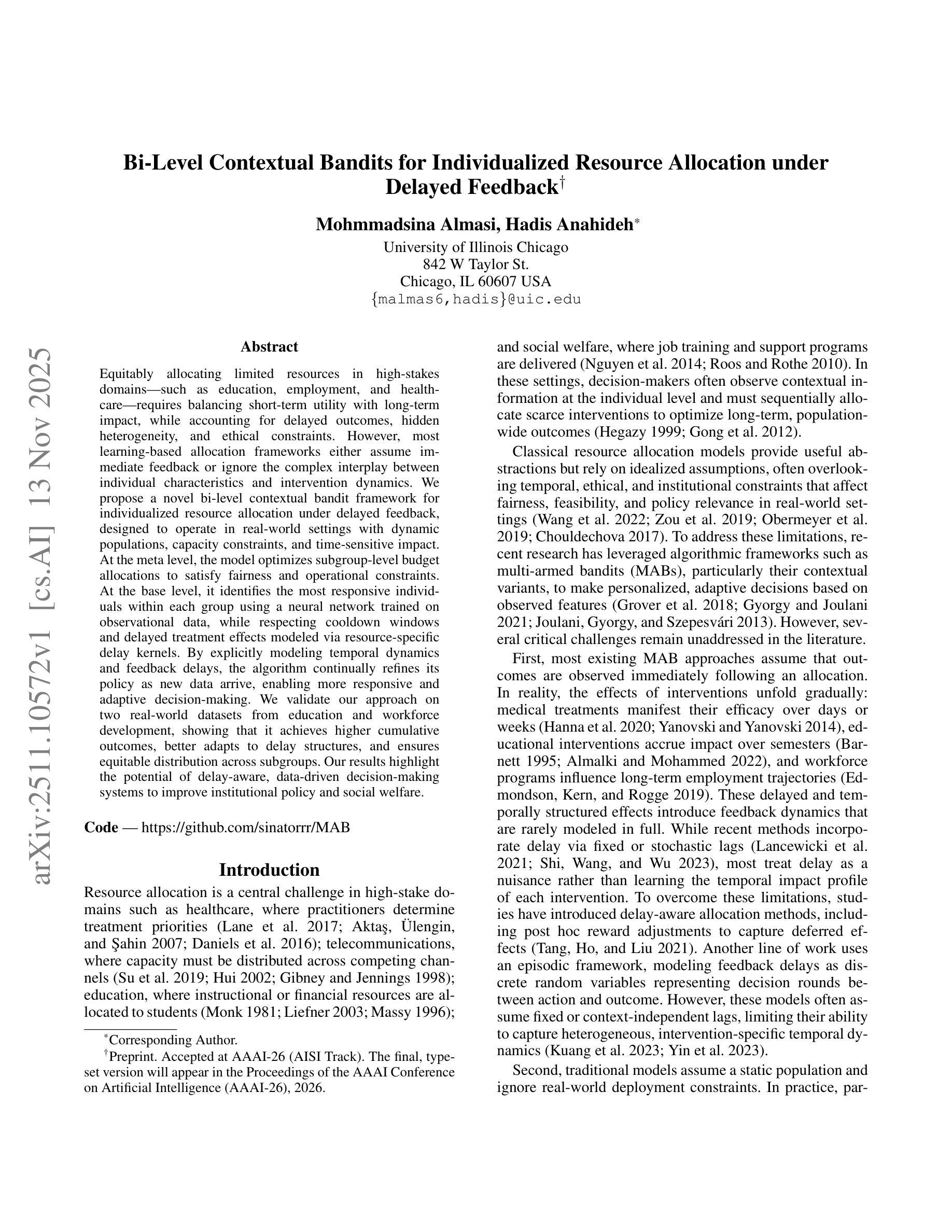 在诸如教育、就业和医疗保健等高风险领域中公平分配有限资源,需要在权衡短期效用与长期影响的同时,考虑到结果延迟、隐性异质性和道德约束。然而,大多数基于学习的分配框架要么假设即时反馈,要么忽视个体特征与干预动态之间的复杂相互作用。我们针对延迟反馈环境下的个性化资源分配问题,提出了一个新型的两级上下文强盗框架,旨在在具有动态人群、容量约束和时间敏感影响的现实环境中运行。在元级别上,该模型优化群体层面的预算分配以满足公平性和操作约束。在基础层面上,它利用基于观测数据训练的神经网络识别每组中最有反应的个人,同时尊重冷却窗口和通过特定资源延迟内核建模的延迟治疗效果。通过显式建模时间动态和反馈延迟,该算法随着新数据的到来不断完善其政策,使决策更具响应性和适应性。我们通过教育和工作力发展领域的两个真实数据集验证了我们的方法,结果表明它实现了更高的累积成果,更好地适应了延迟结构,并确保了在各群体之间的公平分配。我们的结果突出了延迟感知、数据驱动的决策系统的潜力,可以改进机构政策并提高社会福利。
