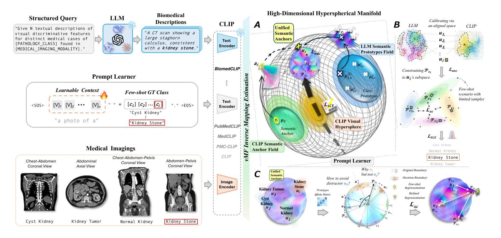 - vMFCoOp框架通过共享超球面流形上的逆向估计von Mises-Fisher(vMF)分布来对齐语义偏差,实现了稳健的生物医学提示和优越的小样本分类。