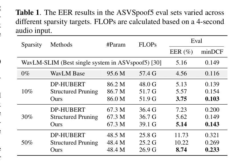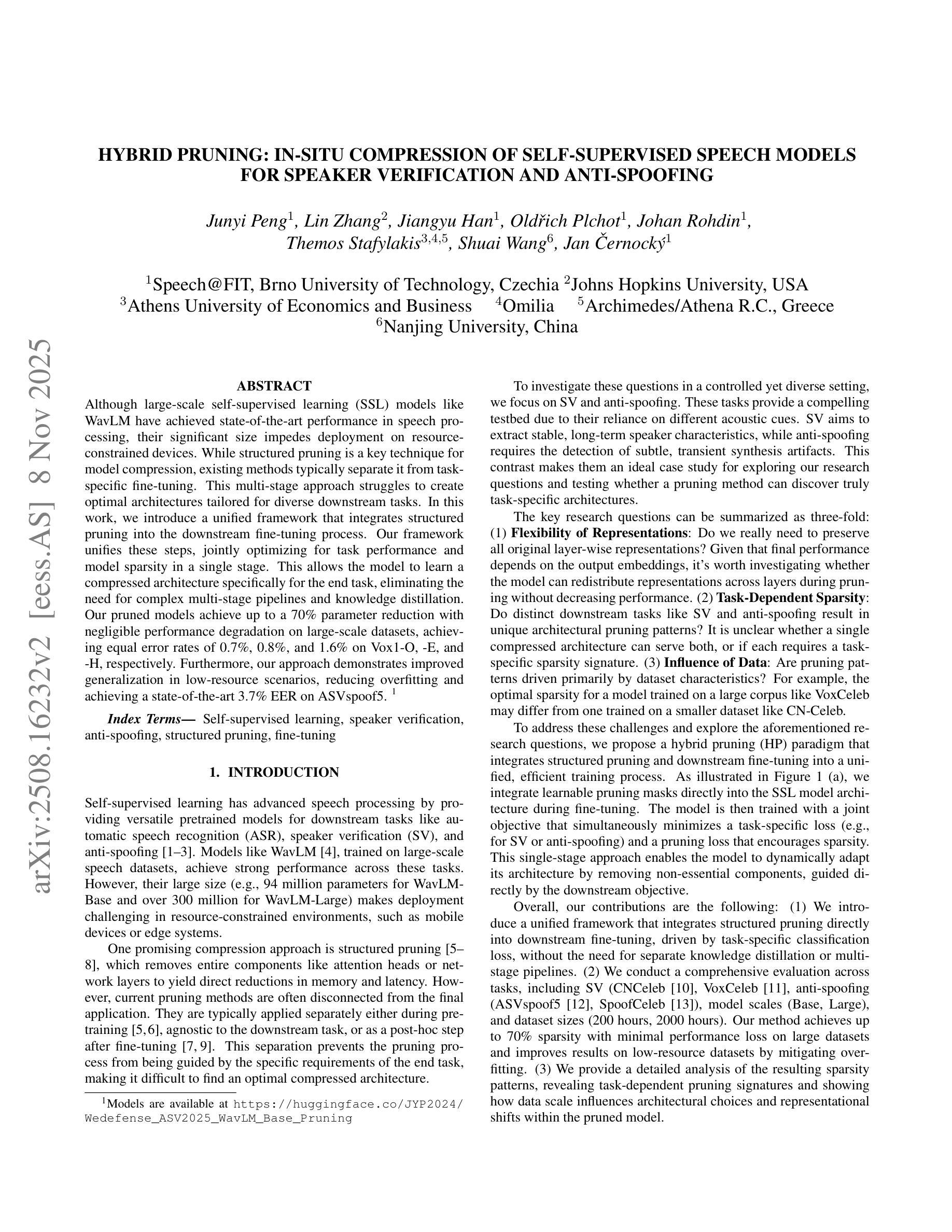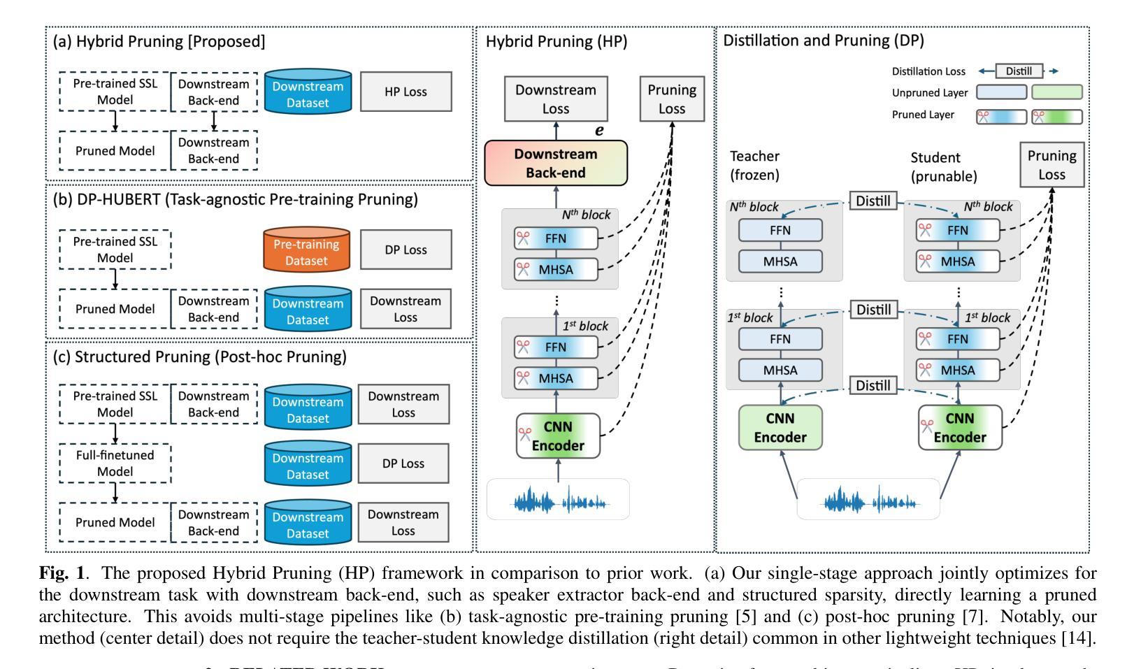 虽然像WavLM这样的大规模自监督学习(SSL)模型在语音识别中取得了最先进的性能,但它们的大规模部署在资源受限的设备上存在困难。虽然结构化剪枝是模型压缩的关键技术,但现有方法通常将其与特定任务的微调分开。这种多阶段的方法很难为各种下游任务创建最佳架构。在这项工作中,我们介绍了一个统一的框架,该框架将结构化剪枝集成到下游微调过程中。我们的框架统一了这些步骤,联合优化任务性能和模型稀疏性,在一个阶段内完成。这允许模型为终端任务学习特定的压缩架构,从而消除了复杂的多阶段管道和知识蒸馏的需求。我们的修剪模型实现了高达70%的参数减少,在大规模数据集上的性能下降微乎其微,在Vox1-O、-E和-H上的错误率分别为0.7%、0.8%和1.6%。此外,我们的方法在资源稀缺的场景中展示出了更好的泛化能力,减少了过拟合现象,并在ASVspoof5上达到了最先进的3.7%的EER(等错误率)。