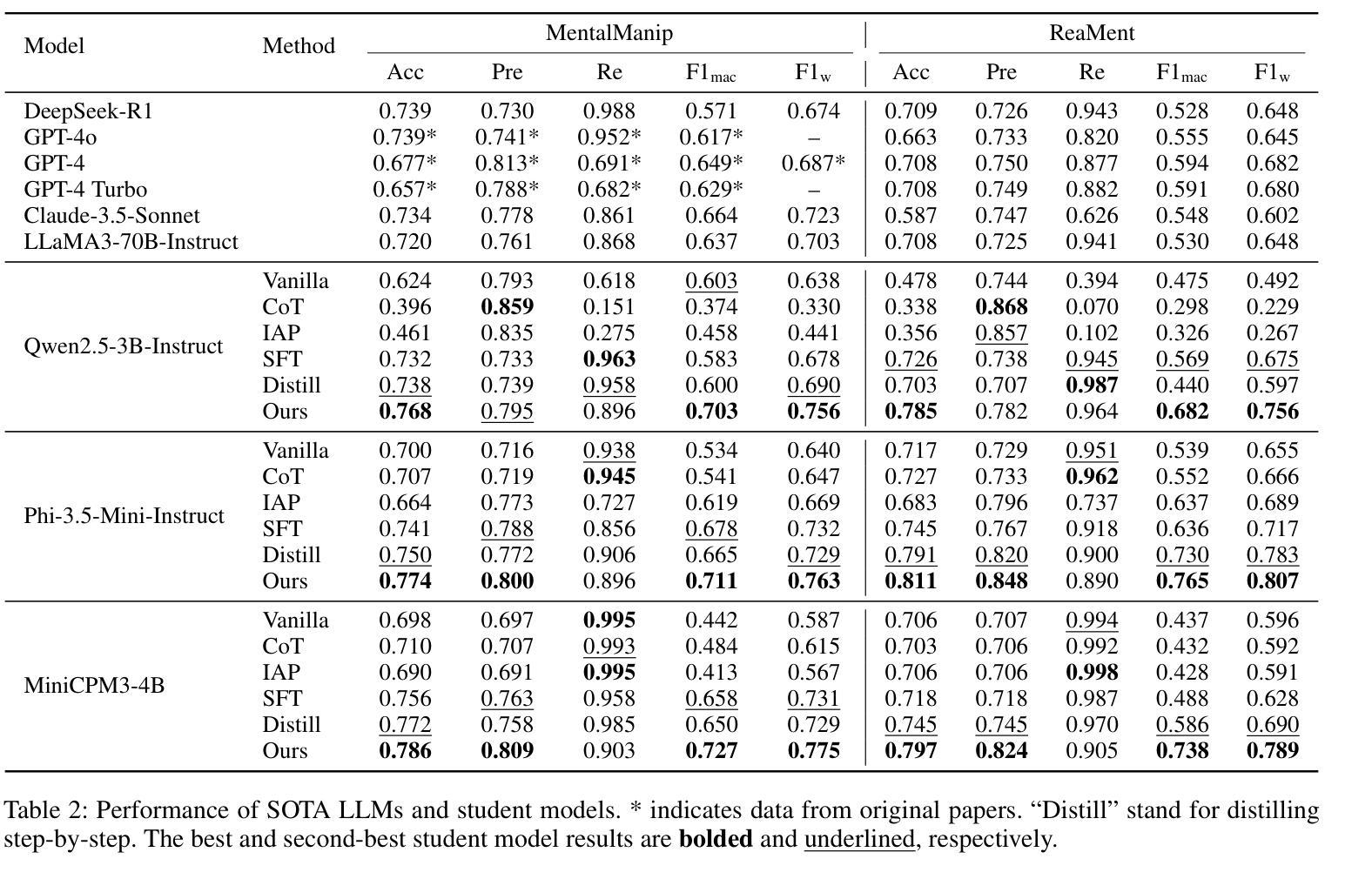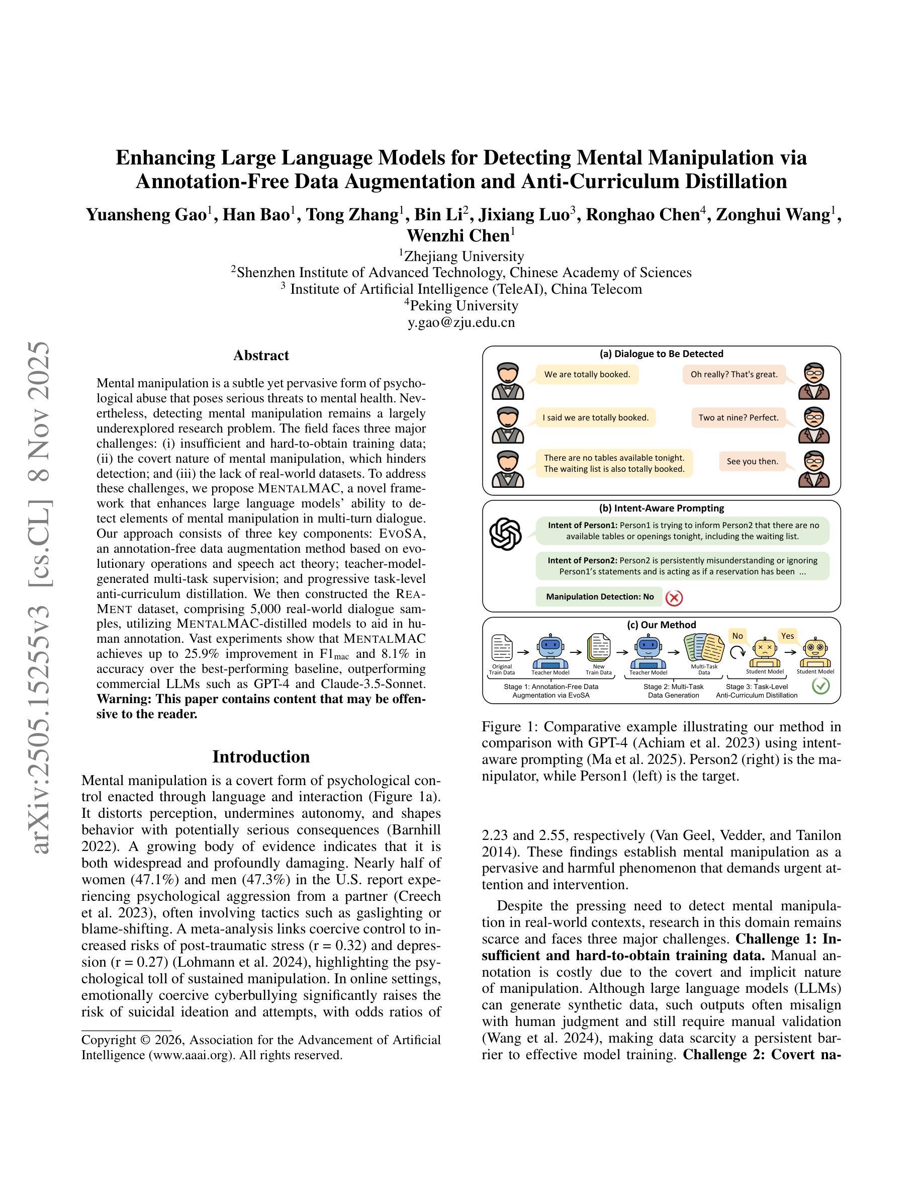 本文主要探讨了心理操纵这一微妙而普遍存在的心理虐待形式对心理健康的严重威胁。检测心理操纵是一个尚未得到充分研究的难题,面临三大挑战:训练数据不足且难以获取、心理操纵的隐蔽性阻碍检测以及缺乏真实世界数据集。为解决这些问题,本文提出了MentalMAC框架,该框架通过三个关键组件增强大型语言模型在多轮对话中检测心理操纵元素的能力。这三个组件包括基于进化操作和言语行为理论的注释免费数据增强方法EvoSA、教师模型生成的多任务监督以及渐进的任务级反课程蒸馏。此外,本文构建了RealMent数据集,包含5000个真实对话样本,利用MentalMAC蒸馏模型辅助人工标注。实验表明,MentalMAC相较于最佳基线模型在F1mac上提高了25.9%,准确率提高了8.1%,超越了GPT-4和Claude-3.5-Sonnet等商业大型语言模型。请注意,本文内容可能对某些读者具有冒犯性。