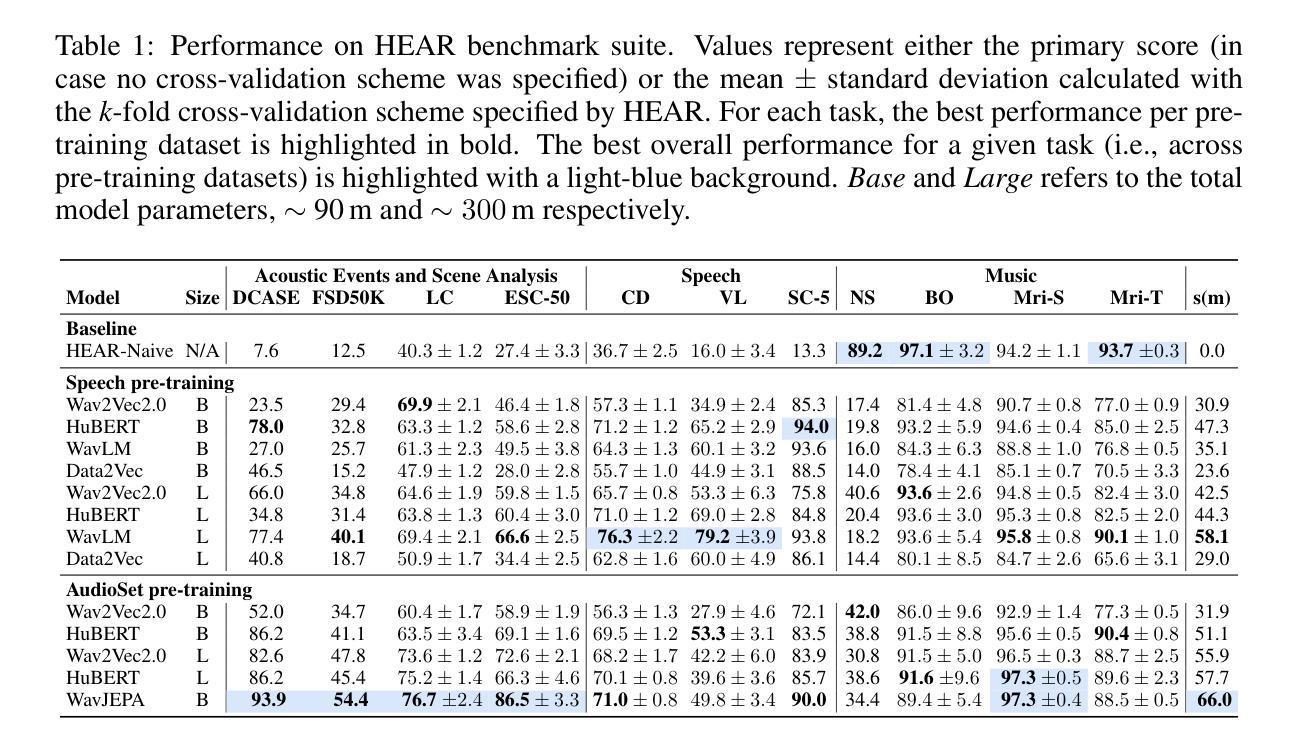 - WavJEPA在多种下游基准任务上表现优异,优于时域音频基础模型的最新技术,且计算资源消耗较少。