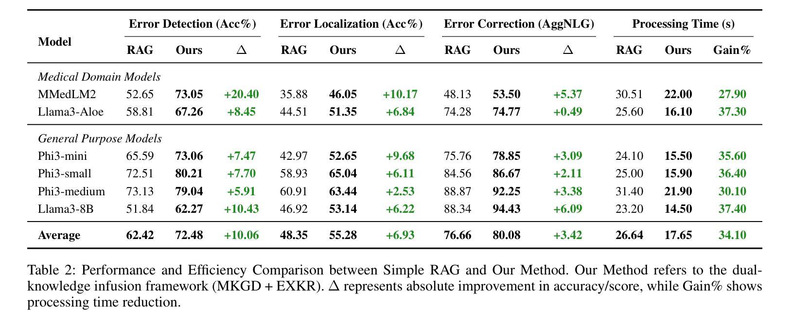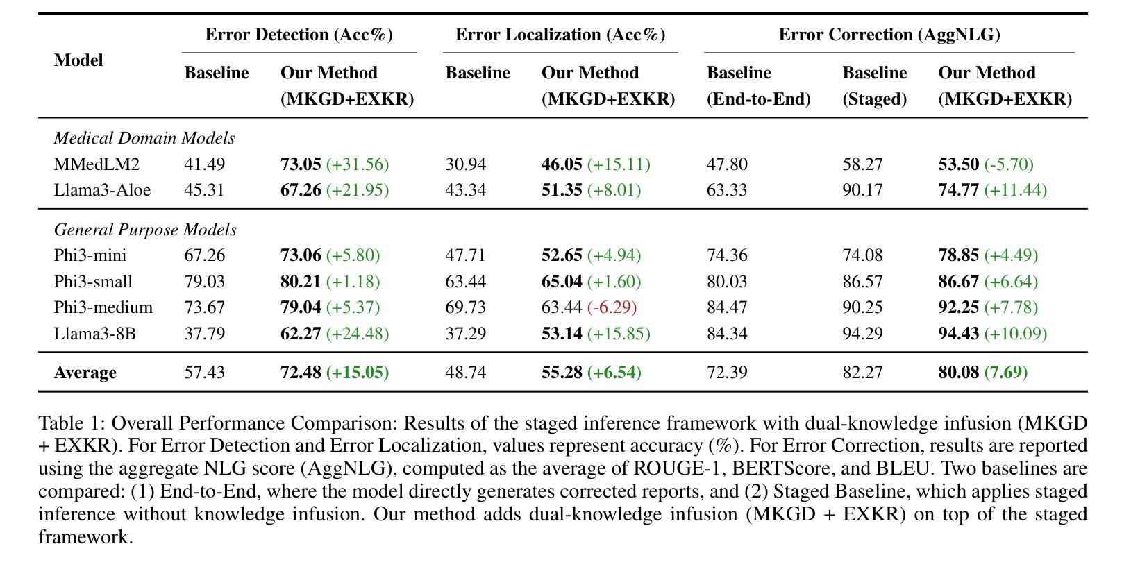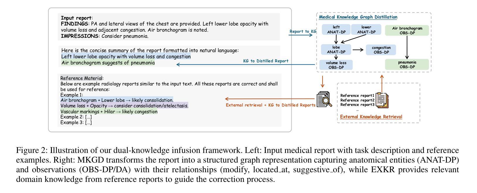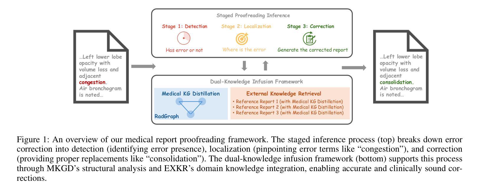 - 提出了一种新型双知识融合框架,整合医学专业知识,提高了LLMs在放射报告校对方面的能力。