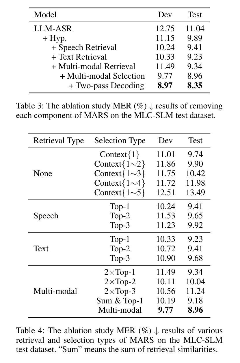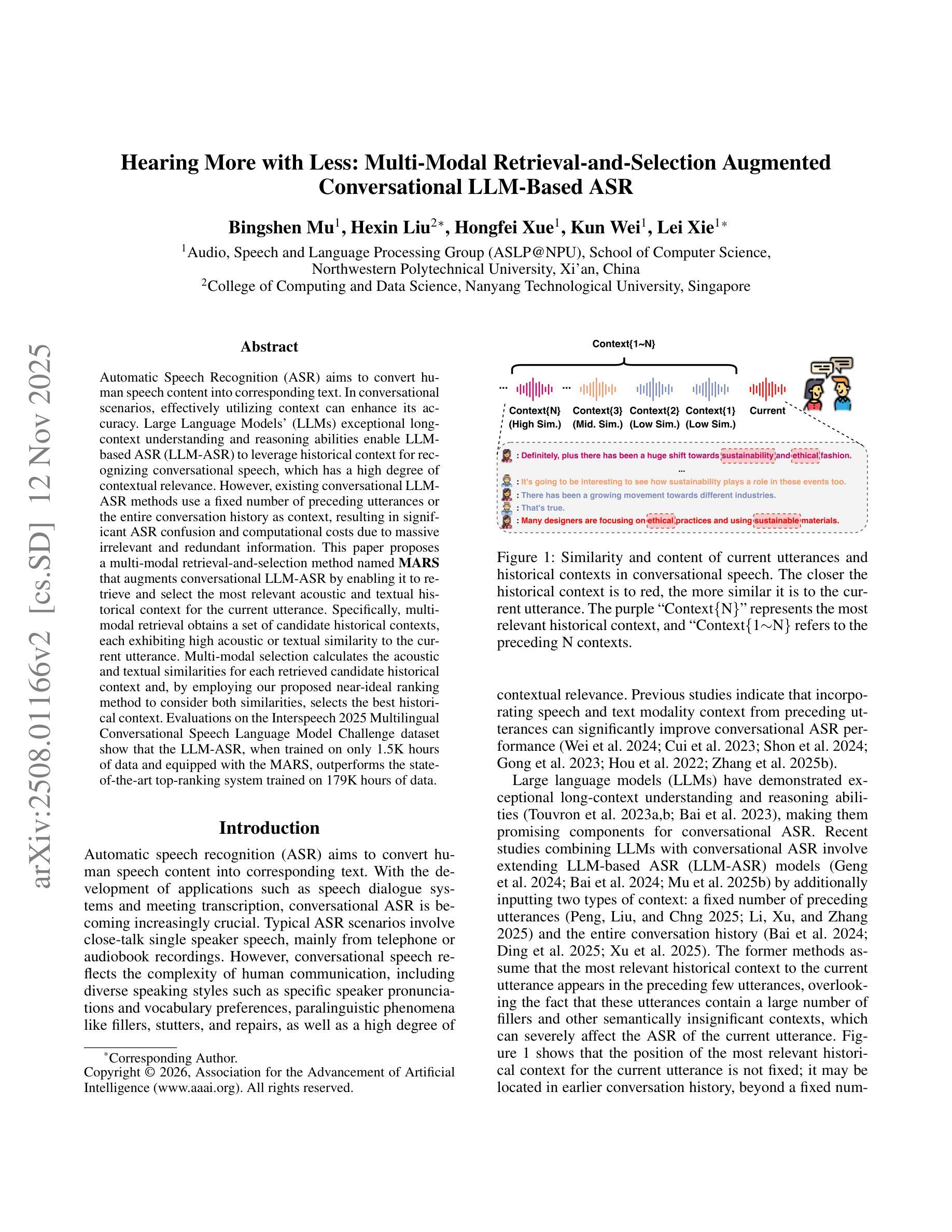 自动语音识别(ASR)旨在将人类语音内容转换为相应的文本。在对话场景中,有效地利用上下文可以提高其准确性。大型语言模型(LLM)出色的长文本理解和推理能力,使基于LLM的ASR(LLM-ASR)能够利用历史上下文来识别对话语音,这些语音具有高度的上下文相关性。然而,现有的对话式LLM-ASR方法使用固定数量的先前发言或整个对话历史作为上下文,这会导致大量的无关和冗余信息,从而导致ASR混淆和计算成本。本文针对这一问题,提出了一种名为MARS的多模态检索与选择方法,它通过检索和选择与当前发言最相关的声音和文字历史上下文,增强了对话式LLM-ASR的功能。具体来说,多模态检索会获取一组候选历史上下文,每个上下文都表现出与当前发言高度相似的声音或文字。多模态选择会计算每个检索到的候选历史上下文的语音和文字相似性,并通过采用我们提出的理想排名方法,综合考虑这两种相似性,选择最佳历史上下文。在Interspeech 2025多语种对话语音语言模型挑战赛数据集上的评估显示,仅经过1.5K小时数据训练的LLM-ASR,配备MARS后,其性能优于在17.9万小时数据上训练的最新顶尖系统。