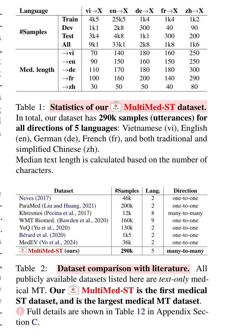 - MultiMed-ST数据集是迄今为止最大的医疗机器翻译数据集和跨领域最多的多语种翻译数据集。