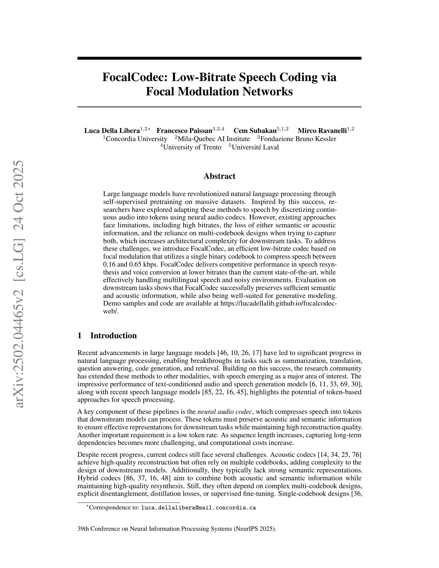 大规模语言模型通过海量数据的自监督预训练,已经彻底改变了自然语言处理的格局。受此成功的启发,研究人员已经探索了使用神经音频编解码器将连续音频离散化为令牌,以适应语音处理的方法。然而,现有方法存在局限性,包括比特率高、语义或声学信息丢失,以及在尝试捕获两者时依赖多码本设计,这增加了下游任务的架构复杂性。为了应对这些挑战,我们引入了FocalCodec,这是一种基于焦点调制的有效低比特率编解码器,它利用单个二进制码本在0.16至0.65kbps之间压缩语音。FocalCodec在较低的比特率下实现了与当前最佳水平相当的语音再合成和语音转换性能,同时有效处理多语言语音和嘈杂环境。下游任务的评估表明,FocalCodec成功保留了足够的语义和声音信息,同时非常适合生成建模。演示样本和代码可在https://lucadellalib.github.io/focalcodec-web/找到。