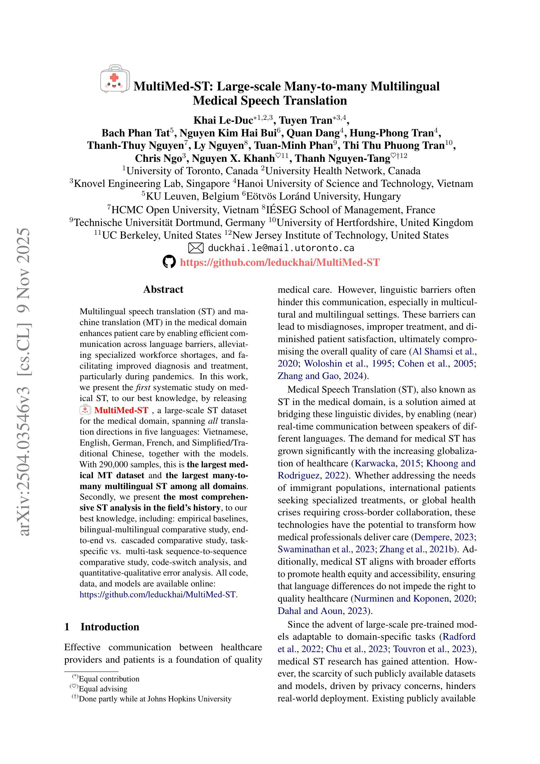 - 发布了一个大规模的医疗ST数据集MultiMed-ST,包含五种语言的29万个样本。