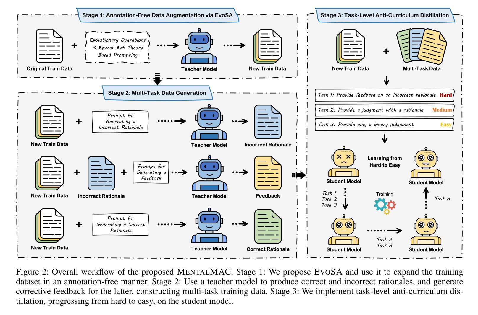 - MentalMAC框架通过三个关键组件解决这些挑战:EvoSA数据增强方法、教师模型生成的多任务监督以及任务级反课程蒸馏。