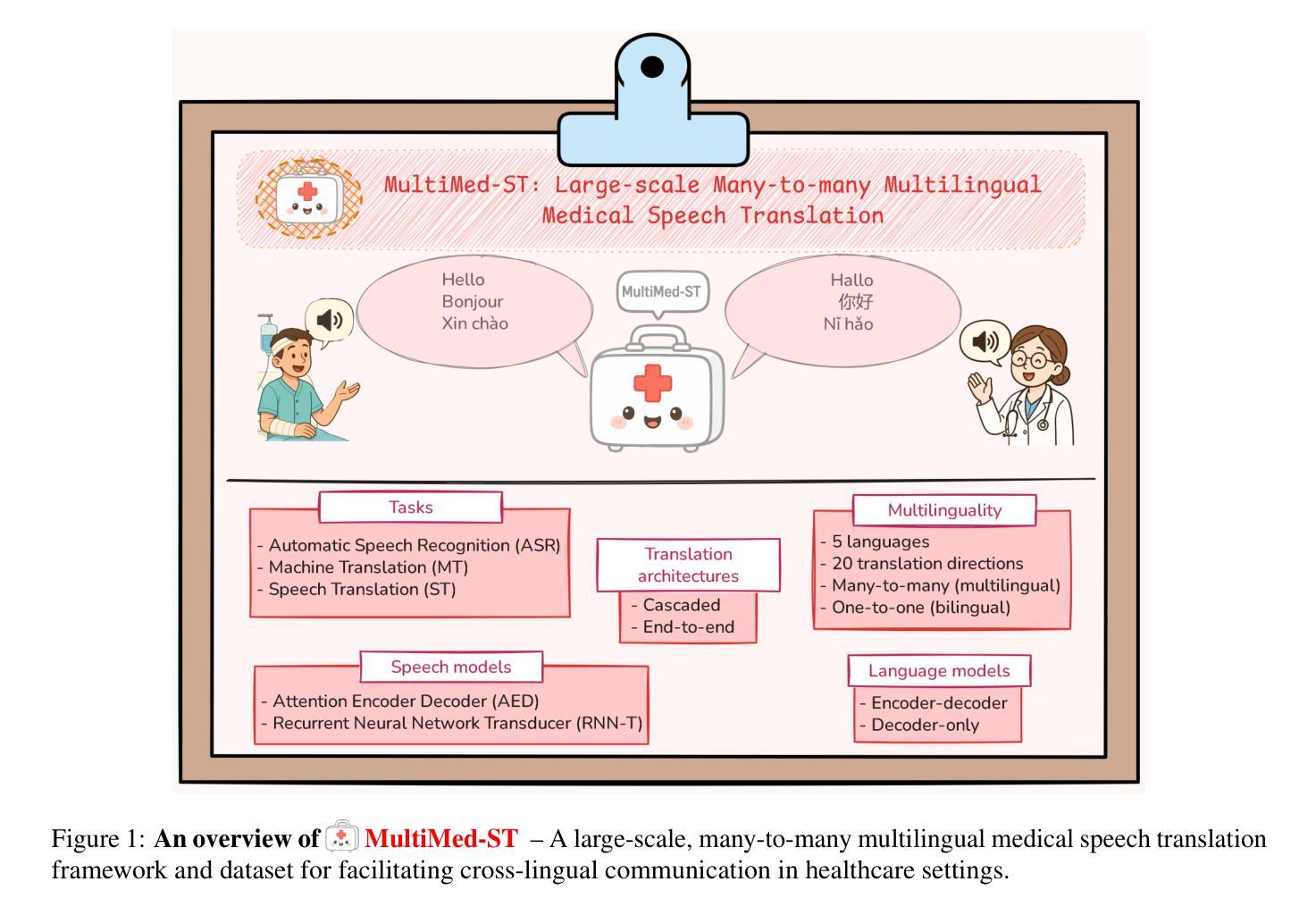 在医疗领域,多语言语音识别翻译(ST)和机器翻译(MT)通过突破语言障碍实现高效沟通、缓解专业劳动力短缺以及促进诊断和治疗的改善,特别是在疫情期间,增强了患者护理。在这项工作中,我们首次对医疗ST进行了系统研究,据我们所知,通过发布MultiMed-ST数据集,该数据集是医疗领域的大规模ST数据集,涵盖五个语言的所有翻译方向:越南语、英语、德语、法语和简体中文/繁体中文,以及相应的模型。包含29万个样本,这是最大的医疗MT数据集和所有领域中最大的多语种ST数据集。其次,据我们所知,我们还进行了该领域历史上最全面的ST分析,包括:实证研究基准线、双语-多语对比研究、端到端与级联对比研究、任务特定与多任务序列到序列对比研究、代码切换分析和定量-定性误差分析。所有代码、数据和模型均可在网上找到:https://github.com/leduckhai/MultiMed-ST。