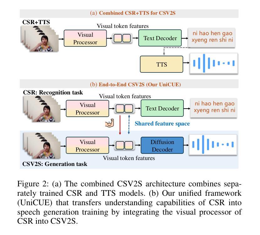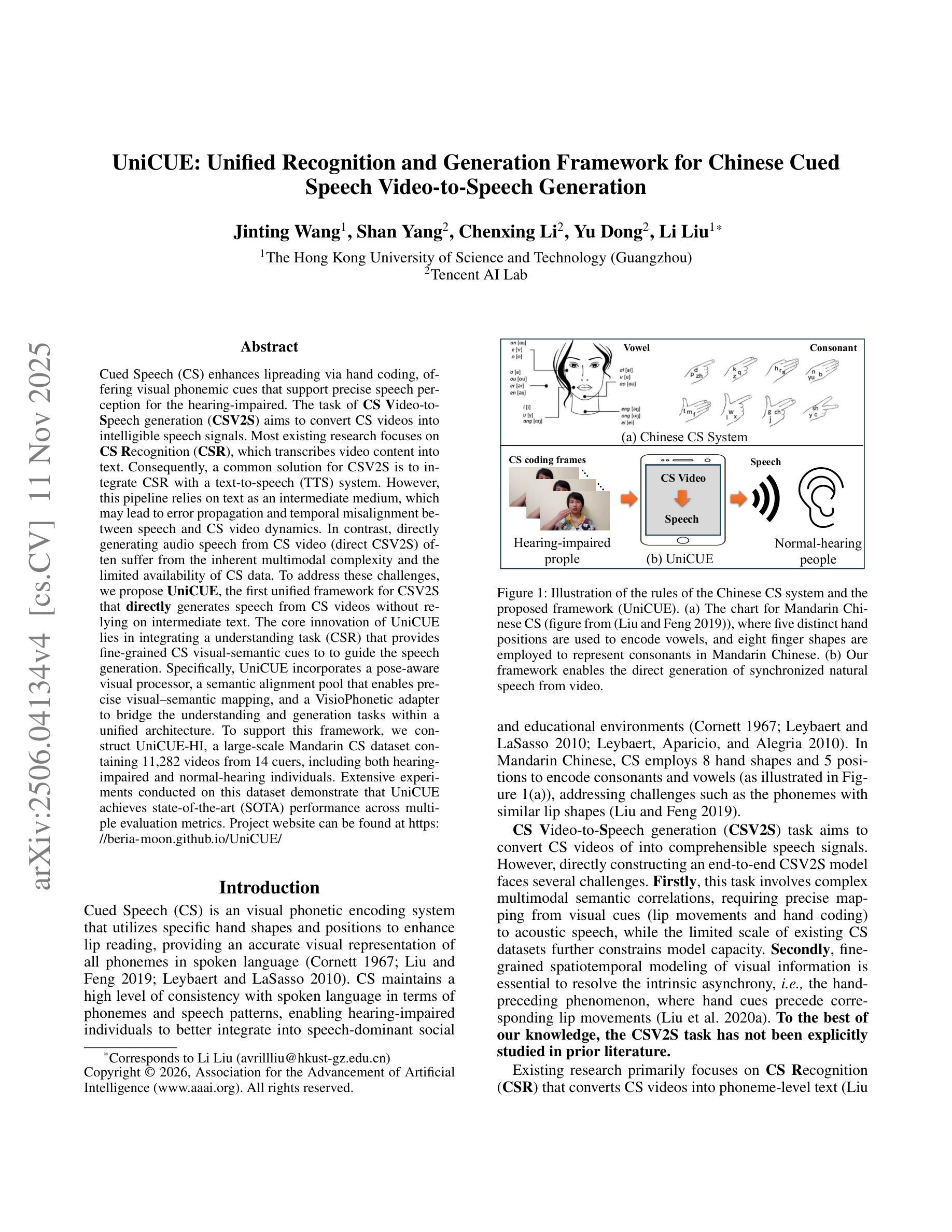 提示语音(CS)通过手语编码增强唇读能力,提供视觉语音线索,支持听力受损者准确感知语音。CS视频到语音生成(CSV2S)的任务旨在将CS视频转换为可理解的语音信号。目前大多数研究都集中在CS识别(CSR)上,即将视频内容转录为文本。因此,CSV2S的常见解决方案是将CSR与文本到语音(TTS)系统结合起来。然而,这个流程依赖于文本作为中间媒介,这可能导致误差传播以及语音和CS视频动态之间的时间不对齐。相比之下,直接从CS视频生成音频语音(直接CSV2S)往往受到固有的多模式复杂性和有限的CS数据可用性的困扰。为了解决这些挑战,我们提出了UniCUE,这是第一个用于CSV2S的统一框架,能够直接从CS视频生成语音,无需依赖中间文本。UniCUE的核心创新在于整合了一个理解任务(CSR),提供精细的CS视觉语义线索来指导语音生成。具体来说,UniCUE融入了一个姿态感知视觉处理器、一个语义对齐池,能够实现精确视觉语义映射,以及一个VisioPhonetic适配器,能够在统一架构内架起理解和生成任务之间的桥梁。为了支持这一框架,我们构建了UniCUE-HI,这是一个大规模的普通话CS数据集,包含来自14名打手势者的11282个视频,其中包括听障人士和听力正常的人。在该数据集上的大量实验表明,UniCUE在多个评估指标上达到了最新技术水平。