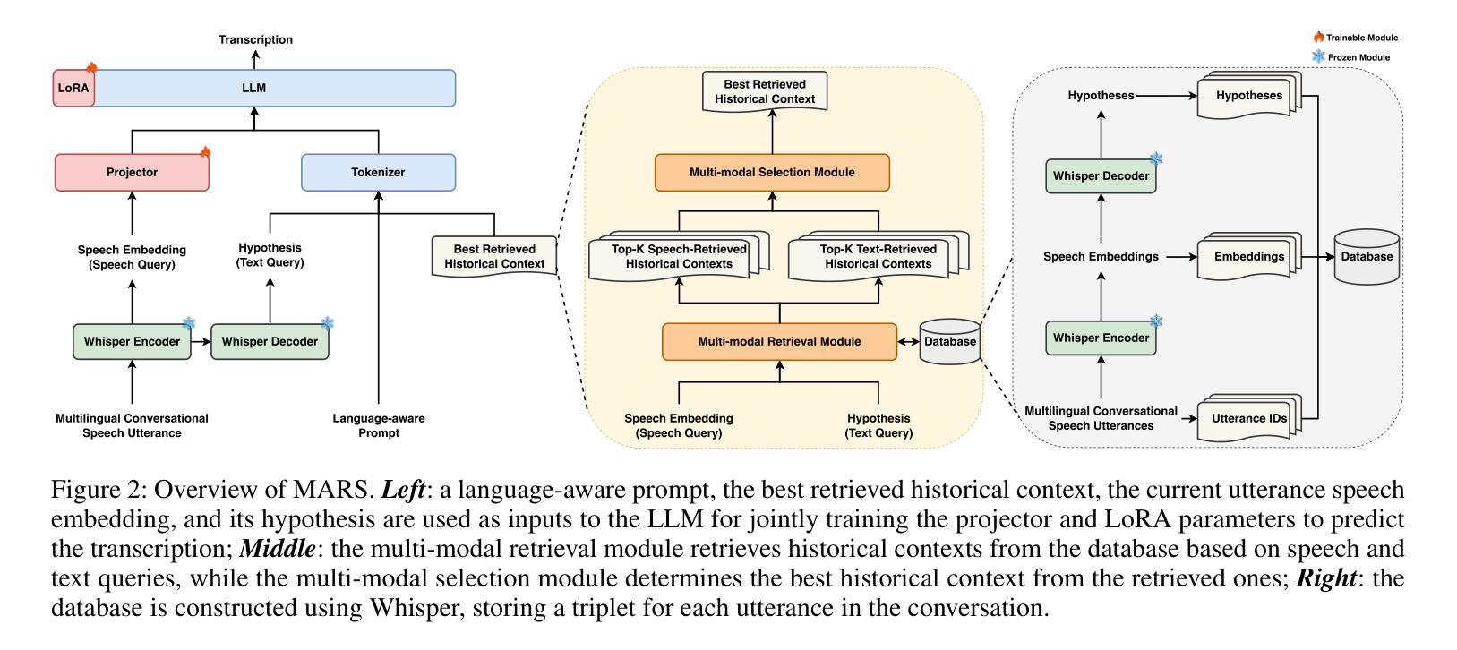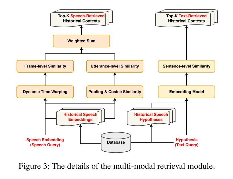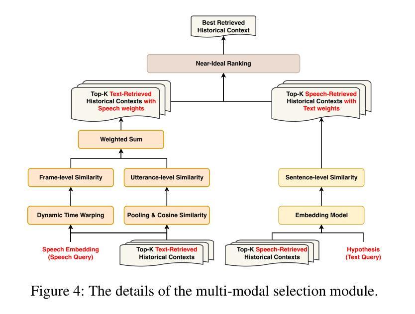 - 多模态检索获取一组候选历史上下文,每个候选上下文与当前话语在声音或文字上高度相似。