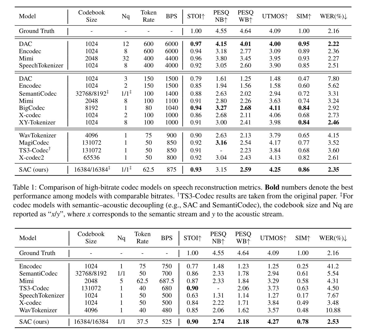 - SAC在多种条件下的重建性能出色,特别是在UTMOS和WER上的得分较高,显示出其优越的感知质量和清晰度。