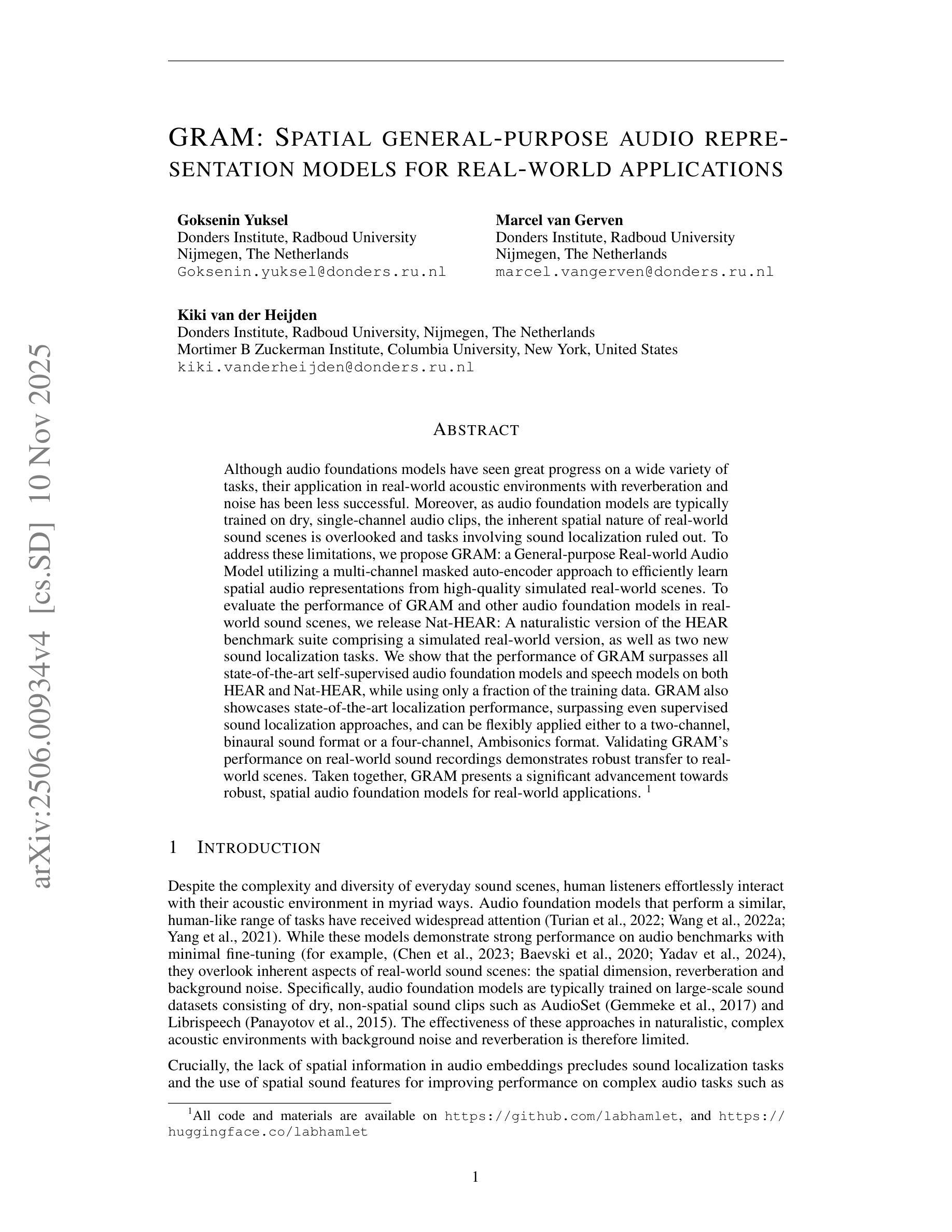 - GRAM利用多通道掩码自编码器方法,从模拟的真实场景中学习空间音频表征。