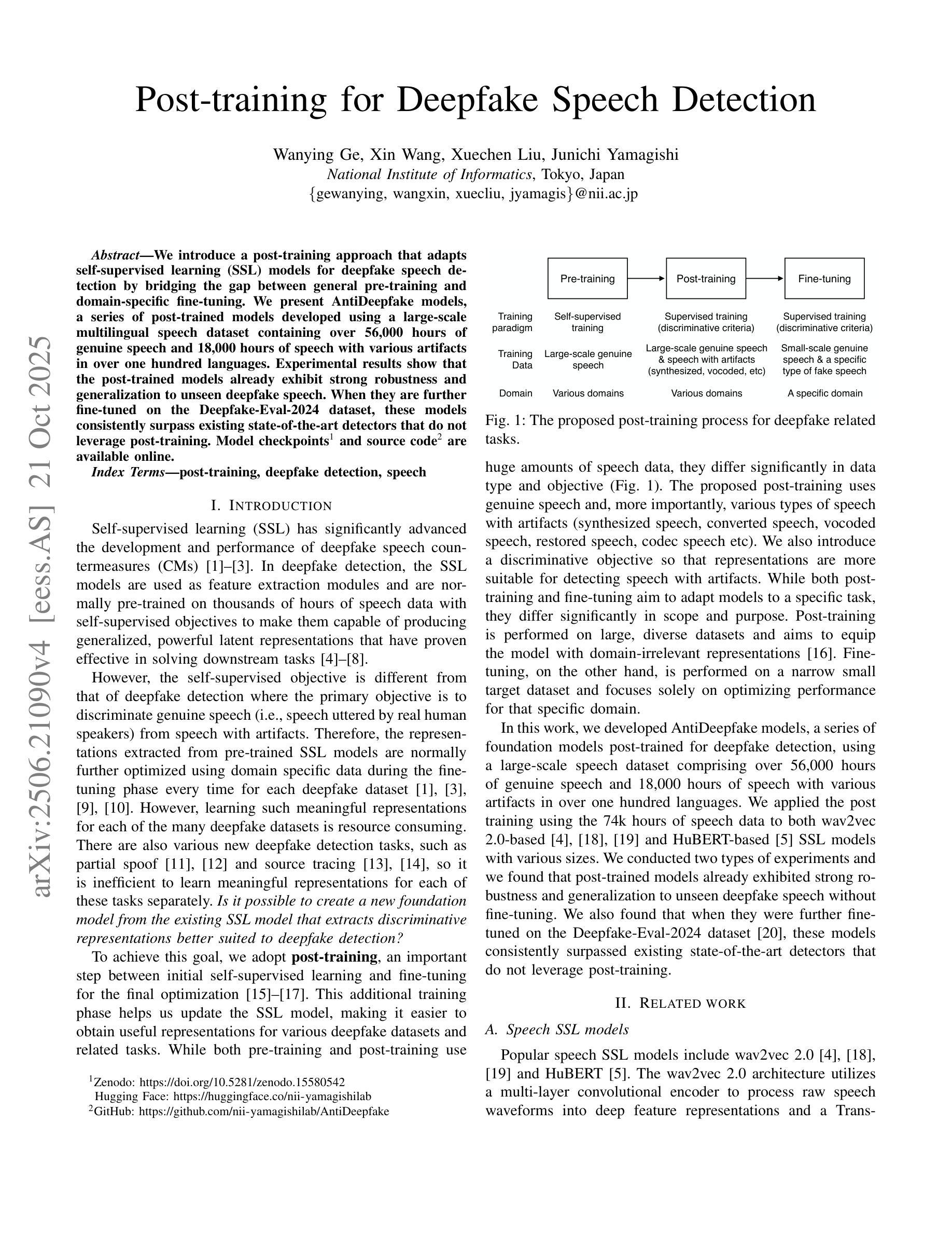 我们介绍了一种后训练的方法,该方法通过弥合通用预训练和特定领域微调之间的差距,使自我监督学习(SSL)模型适应于深度伪造语音检测。我们展示了AntiDeepfake模型系列,这是一系列使用大规模多语言语音数据集开发的后训练模型,包含超过5.6万小时的真实语音和包含各种伪造的超过一万八千小时的语音,涉及一百多种语言。实验结果表明,这些后训练模型已经表现出对未见过的深度伪造语音的强大鲁棒性和泛化能力。当它们在Deepfake-Eval-2024数据集上进行进一步微调时,这些模型的性能始终超过了现有的最先进的检测器,而这些检测器并未利用后训练。模型检查点和源代码均可在网上获取。