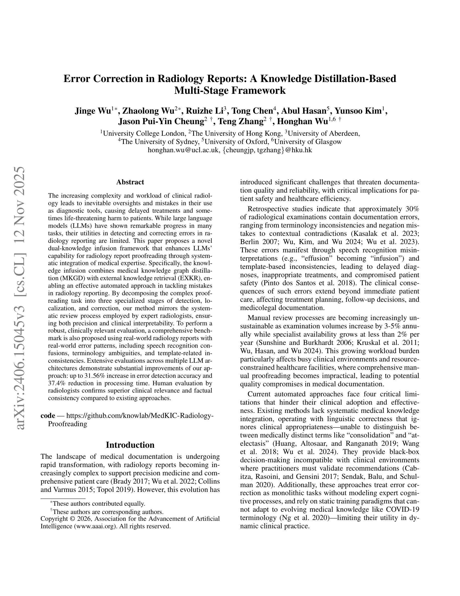 临床放射学的复杂性和工作量不断增加,导致其作为诊断工具时不可避免地会出现疏忽和错误,从而导致治疗延迟,有时甚至会对患者造成危及生命的伤害。尽管大型语言模型(LLM)在许多任务中取得了显著的进步,但在检测和纠正放射学报告中的错误方面的应用仍然有限。本文提出了一种新型的双知识融合框架,通过系统地整合医学专业知识,增强了LLM在放射学报告校对方面的能力。具体来说,知识融合结合了医学知识图谱蒸馏(MKGD)和外部知识检索(EXKR),为实现放射学报告中错误的自动化处理提供了一种有效的方法。通过将复杂的校对任务分解为检测、定位和校正三个专业阶段,我们的方法反映了专家放射科医生所采用的系统审查过程,确保准确性和临床解释性。为了进行稳健且与临床相关的评估,还使用具有真实世界错误模式的真实世界放射学报告提出了一项全面的基准测试,包括语音识别混淆、术语模糊和模板相关的不一致性。对多个LLM架构的广泛评估证明了我们方法的大幅改进:错误检测准确率提高了31.56%,处理时间减少了37.4%。放射科医生的人类评估证实,与现有方法相比,其在临床相关性和事实一致性方面更为优越。