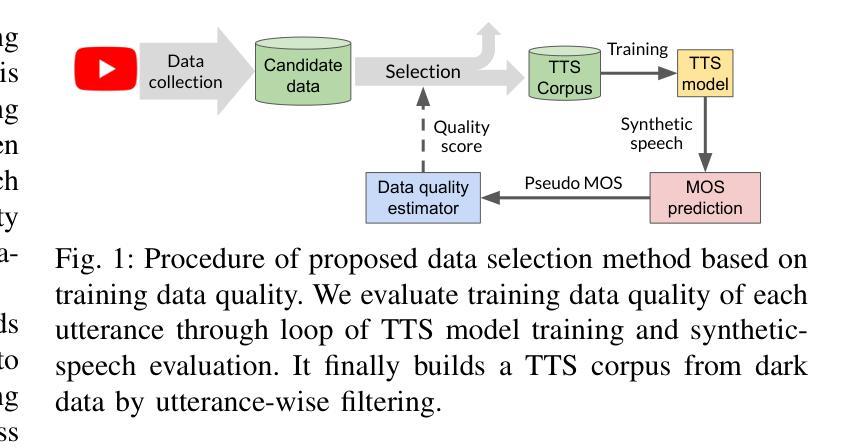 本文介绍了TTSOps,这是一个全自动的闭环框架,用于从嘈杂的、未整理的网页规模语音数据(通常被称为“暗数据”,如在线视频)构建多说话人文本到语音(TTS)系统。传统的TTS训练管道需要高质量、语音文本对齐精确的语料库,这严重限制了可扩展性、说话人多样性和现实世界的适用性。虽然最近的研究已经提出了基于音质的数据选择技术,但它们往往忽略了两个关键方面:(1)现代TTS模型对噪声的固有鲁棒性;(2)感知质量较低但信息丰富的样本的潜在贡献。为了解决这些问题,TTSOps引入了一个以数据为中心的训练管道,该管道集成了三个核心组件:(1)从暗数据源自动收集数据,(2)基于训练数据质量的语句级动态选择数据清洗方法,(3)使用自动预测的平均意见分数(MOS)进行闭环数据选择,以估计每个语句对模型性能的影响。此外,TTSOps在一个闭环框架中联合优化语料库和TTS模型,通过动态适应数据选择和清洗过程来适应目标TTS模型的特征。在日语YouTube数据上的大量实验表明,TTSOps在合成语音的自然性和说话人多样性方面优于基于传统音质质量的基线。