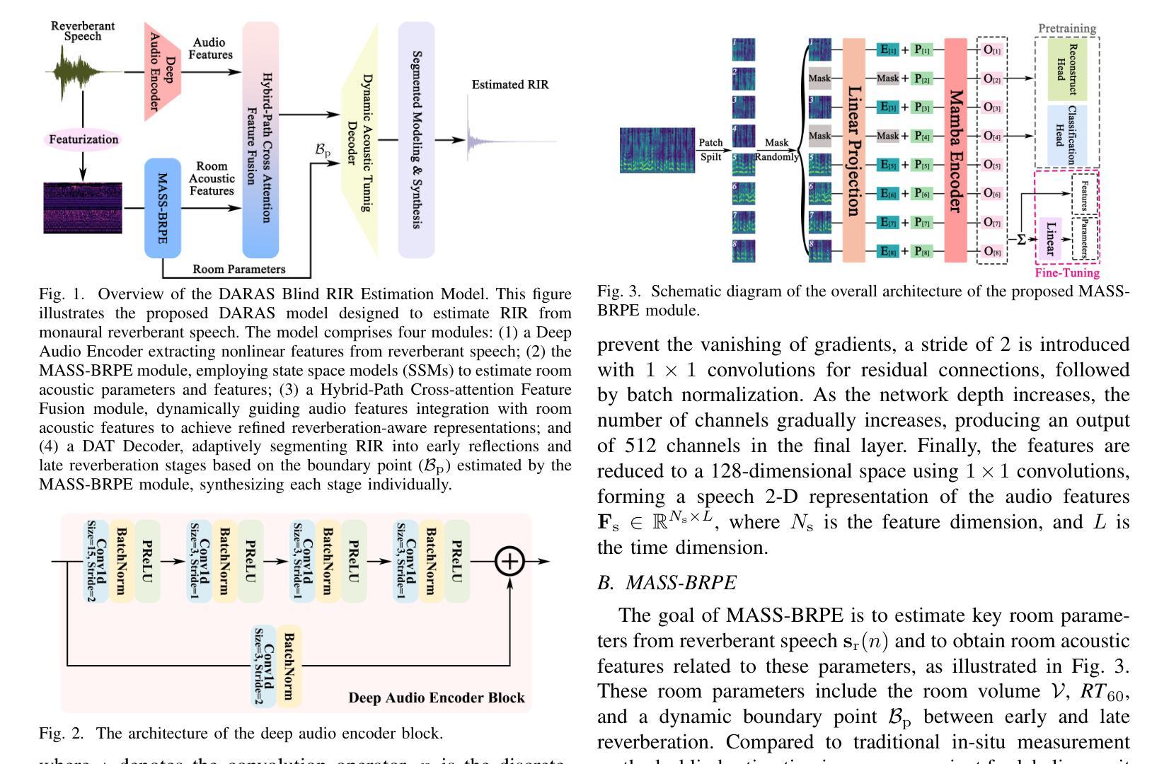 - DARAS包括一个深度音频编码器用于提取非线性潜在空间特征,以及基于Mamba的状态空间模型进行房间声学参数的自我监督盲估计。