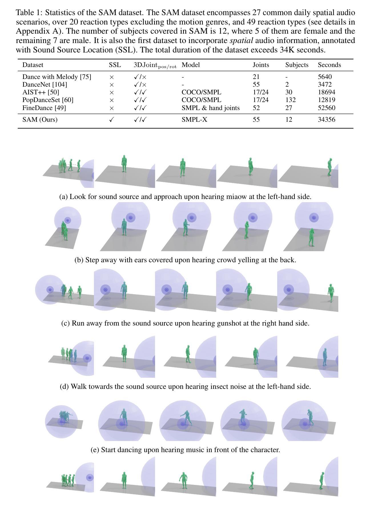 一、构建首个空间音频驱动人体运动(SAM)数据集,包含多样且高质量的空间音频和运动数据。
