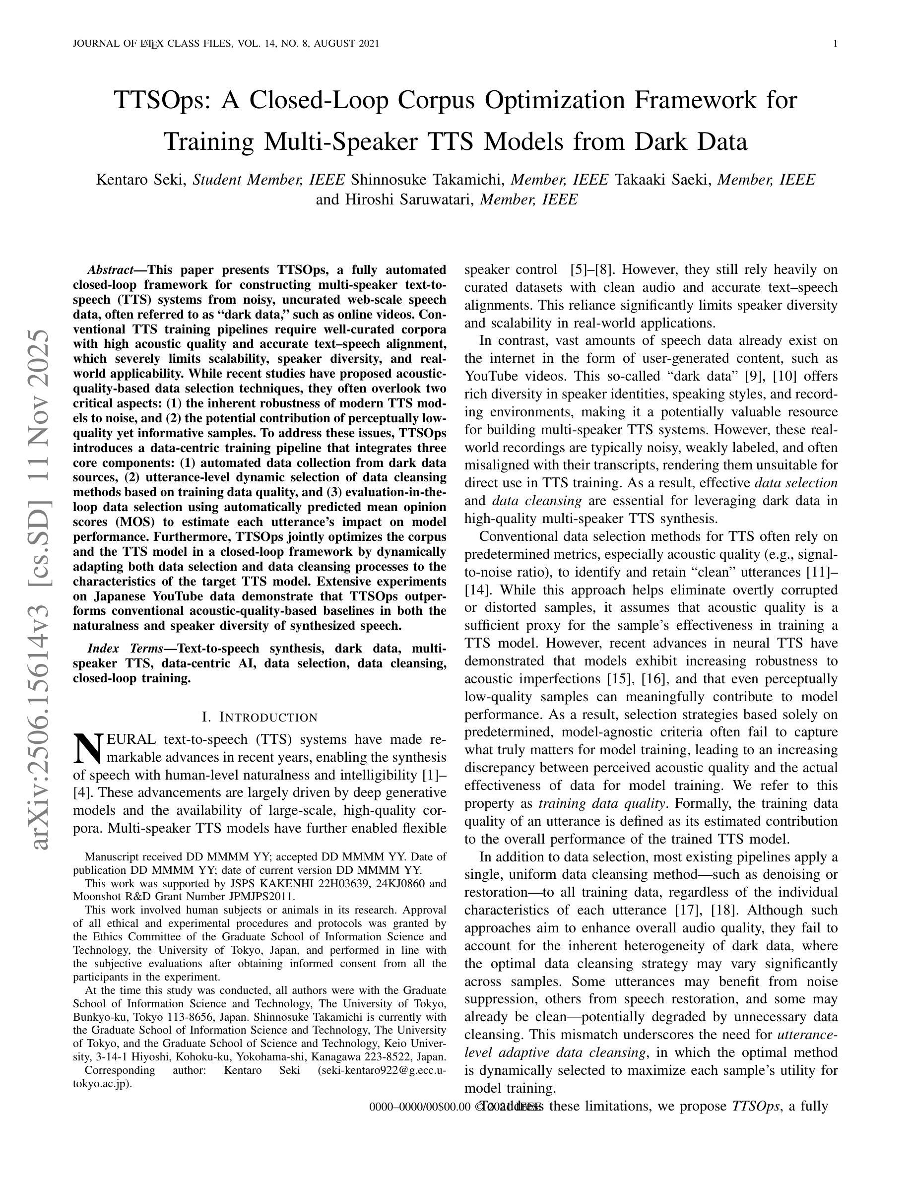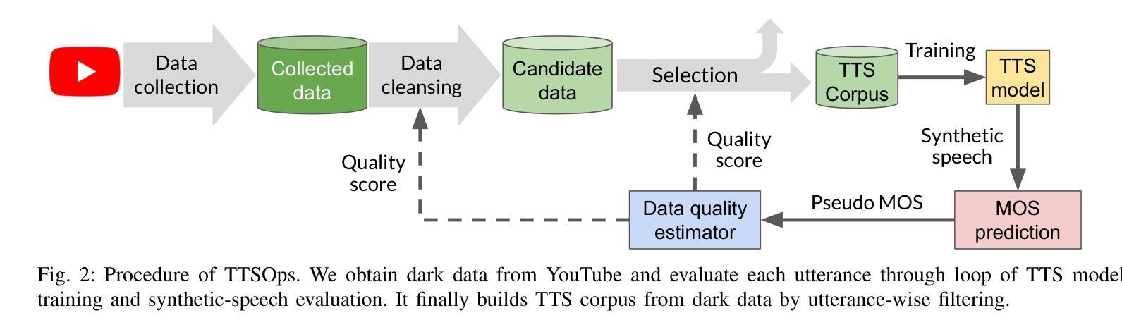 本文介绍了TTSOps,这是一个全自动的闭环框架,用于从嘈杂的、未整理的网页规模语音数据中构建多说话者文本到语音(TTS)系统。与传统TTS训练管道需要大量高质量和精确文本-语音对齐的语料库不同,TTSOps解决了可扩展性、说话者多样性和现实世界应用性的限制。它引入了一个以数据为中心的训练管道,包括自动化数据收集、基于训练数据质量的语句级别动态选择数据清洗方法,以及使用自动预测的平均意见分数(MOS)进行闭环数据选择。TTSOps在目标TTS模型的特性上动态适应数据选择和清洗过程,对日语YouTube数据的实验表明,TTSOps在自然度和说话者多样性方面优于基于声学质量的传统基线。