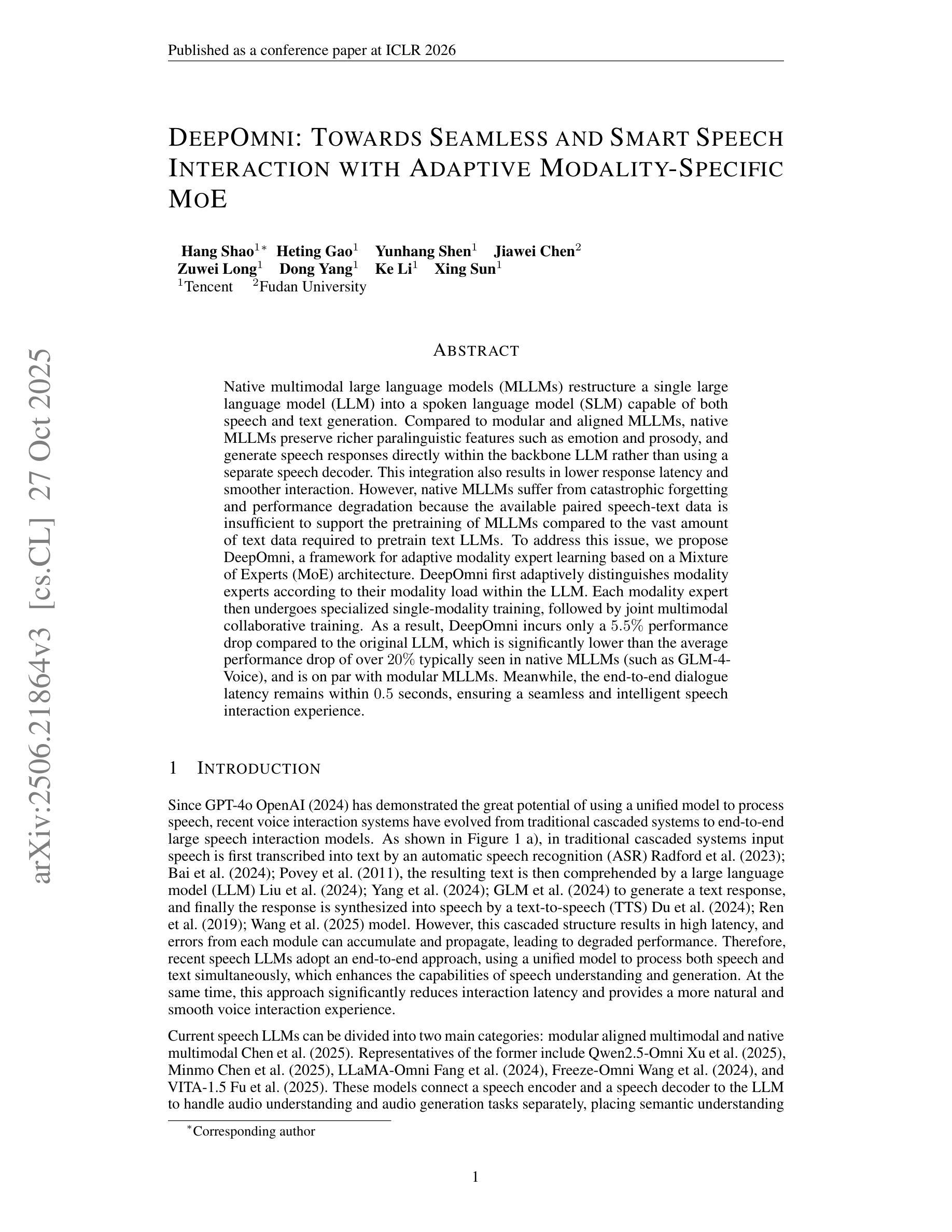 原生多模态大型语言模型(MLLMs)将单一的大型语言模型(LLM)重组为能够生成语音和文本的语音语言模型(SLM)。相比模块化和对齐的MLLMs,原生MLLMs保留了更丰富的副语言特征,如情感和语调,并在主干LLM内部直接生成语音响应,而不是使用单独的语音解码器。但原生MLLMs面临灾难性遗忘和性能下降的问题,因为可用的配对语音-文本数据不足以支持MLLMs的预训练,与需要大量文本数据来预训练文本LLMs的情况相比。为解决此问题,我们提出了基于专家混合(MoE)架构的DeepTalk框架,进行自适应模态专家学习。DeepTalk首先根据LLM内的模态负载自适应地识别模态专家。然后每个模态专家接受专门的单模态训练,接着进行联合多模态协作训练。结果,DeepTalk与原始LLM相比仅性能下降5.5%,远低于原生MLLMs通常出现的超过20%的平均性能下降,并与模块化MLLMs相当。同时,端到端对话延迟保持在0.5秒内,确保流畅智能的语音交互体验。相关代码和模型已发布在https://github.com/talkking/DeepTalk。