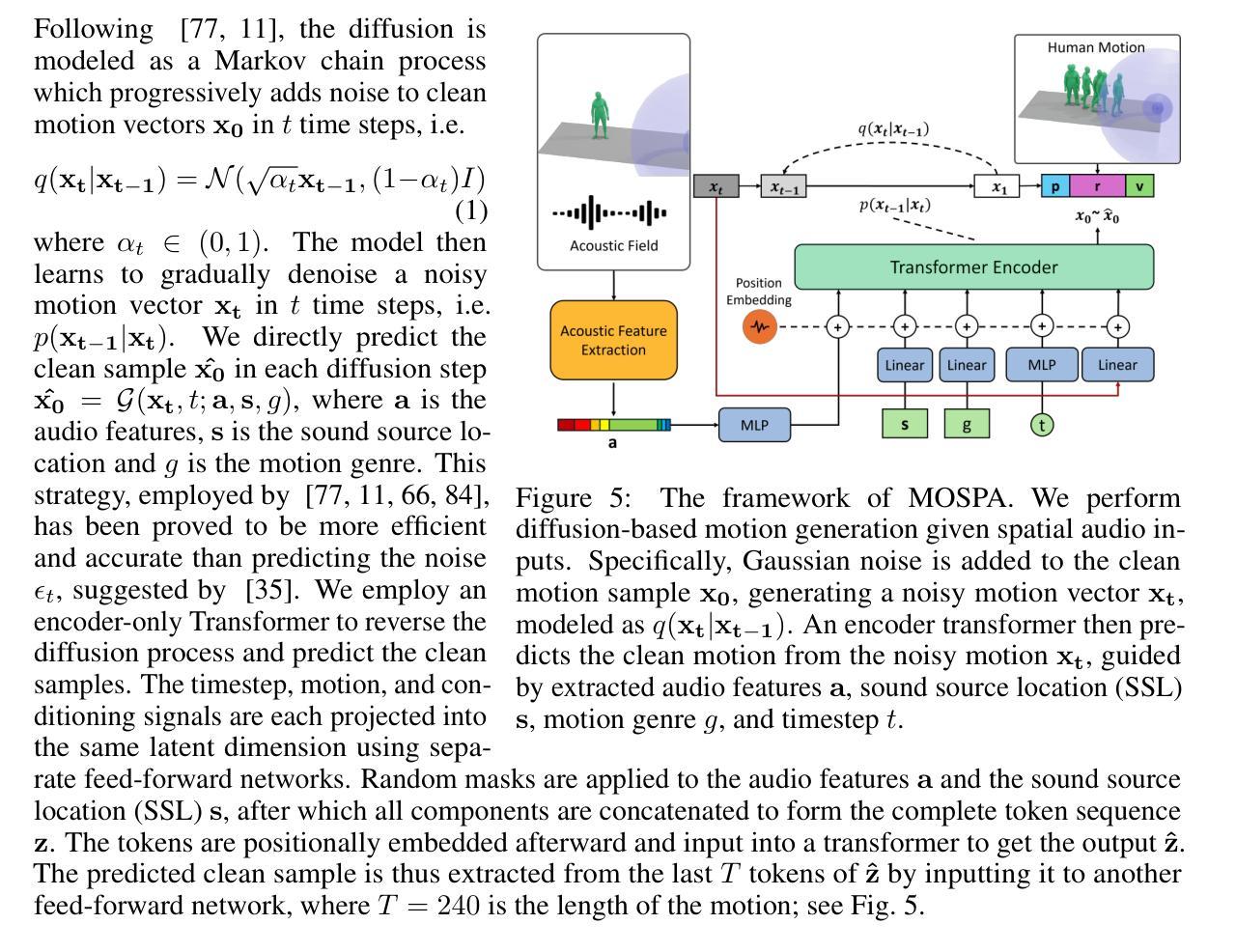 二、提出了一个基于扩散模型的生成框架MOSPA,能够根据空间音频生成虚拟人体运动。该框架能够有效地捕捉空间音频与人体运动之间的关系。