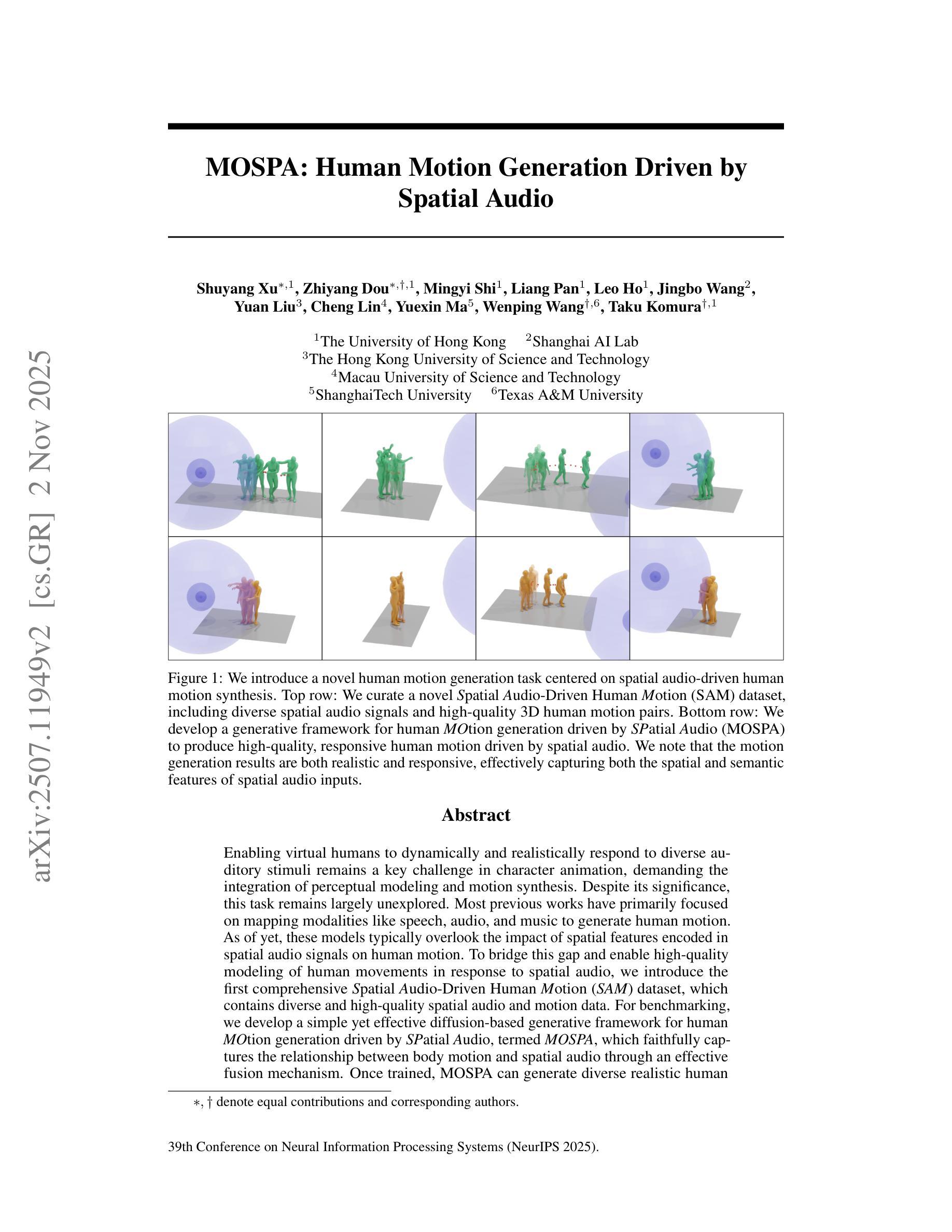 这是一项关于空间音频驱动虚拟人类运动的研究。由于缺少相应的数据集和研究模型,此前对此任务的研究尚处于初步阶段。为此,研究者提出了首个空间音频驱动人体运动(SAM)数据集,旨在通过数据建模提高虚拟人物对空间音频的反应能力。此外,他们还开发了一种基于扩散模型的生成框架MOSPA,能够根据空间音频生成逼真的虚拟人体运动。该研究对虚拟角色的动作表现具有重要的提升作用。数据集和模型已经公开。