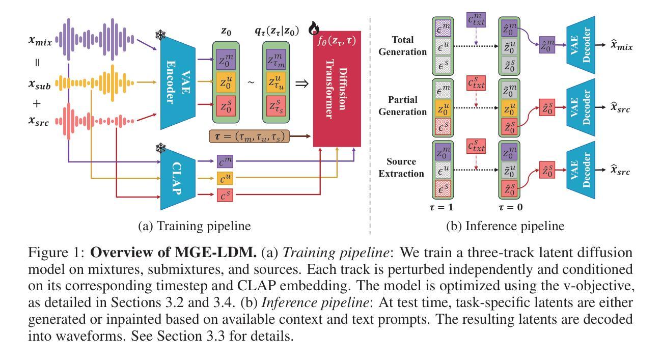 - MGE-LDM是一个统一的潜在扩散框架,用于音乐生成、源补全和查询驱动源分离。