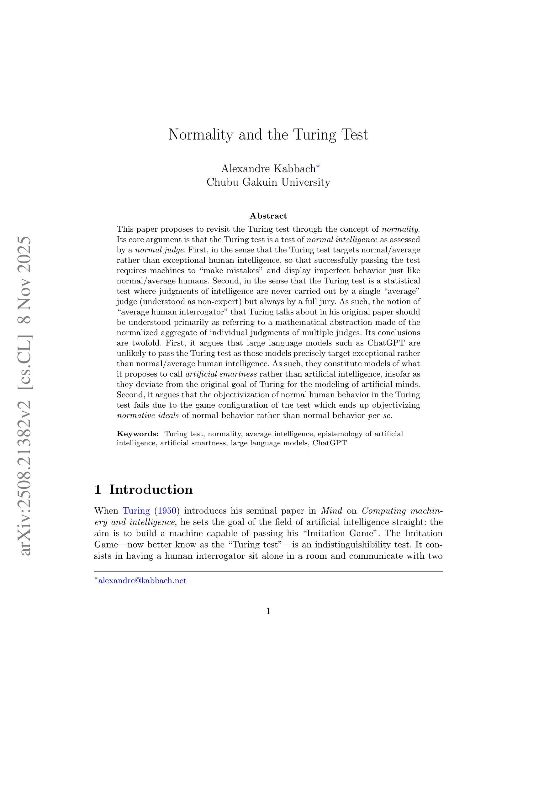 本文提议通过正常性的概念重新考量图灵测试。其核心论点是,图灵测试是测试正常智力的一种方式,这种智力是由正常评判者评估的。首先,从某种程度上讲,图灵测试的目标是测试正常或平均的人类智力,而非超常的智力,因此成功通过测试需要机器像正常或平均人类一样“犯错误”并展现出非完美的行为。其次,图灵测试是一种统计测试,智力的判断并非由单个的“普通”(理解为非专家)评判者做出,而是由一组评判者共同完成。因此,图灵在其原始论文中提到的“普通人类询问者”的概念应该主要被理解为由多个评判者的个人判断标准化汇总后的数学抽象。其结论有两点。首先,它认为大型语言模型如ChatGPT不太可能通过图灵测试,因为这些模型主要针对的是超常而非正常或平均的人类智力。因此,它们构成了所谓的人工智慧模型,而非人工智能模型,因为它们偏离了图灵建模人工心智的初衷。其次,它认为图灵测试中正常人类行为的客观化由于测试的游戏设置而失败,最终客观化的反而是正常行为的标准理想而非本身。