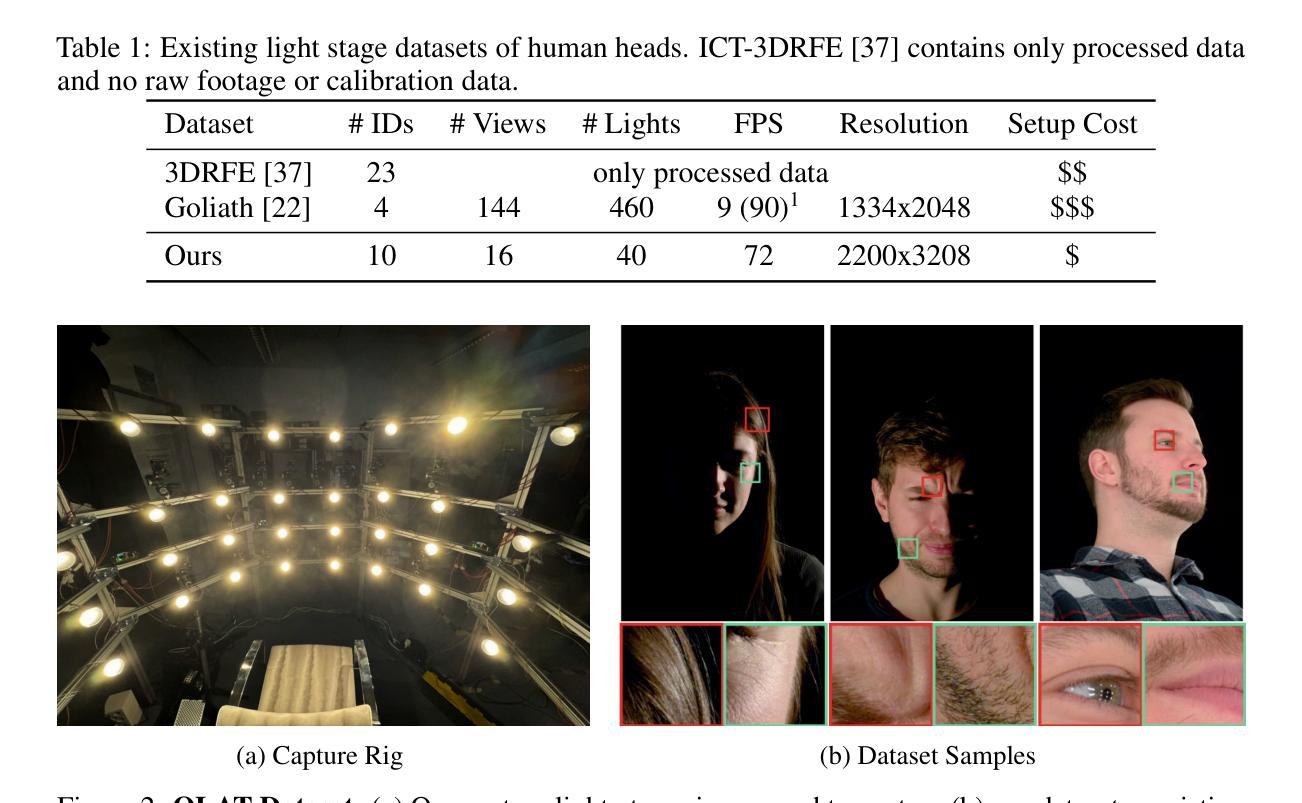 我们介绍了BecomingLit这一新型方法,用于重建可重新照明的、高分辨率的头部化身,这些化身能够以互动速率从全新视角进行渲染。因此,我们提出了一种新的低成本灯光舞台捕捉装置,特别适用于捕捉面部。使用该装置,我们收集了一个包含多种主题在不同照明条件和面部表情下的多样化多角度序列的新型数据集。通过利用我们的新数据集,我们引入了一种基于三维高斯基元的新可重新照明化身表示法,我们使用参数化头部模型和表情依赖的动态模块对其进行动画处理。我们提出了一种新的混合神经着色方法,将神经漫反射BRDF与分析镜面术语相结合。我们的方法从动态光照舞台记录中重建出分离的材料,使我们的化身能够进行全频率重新照明,同时支持点光源和环境映射。此外,我们的化身可以很容易地从单目视频中控制。我们在自己的数据集上进行了大量实验,验证了我们的方法,在重新照明和重演方面始终显著优于现有先进技术。