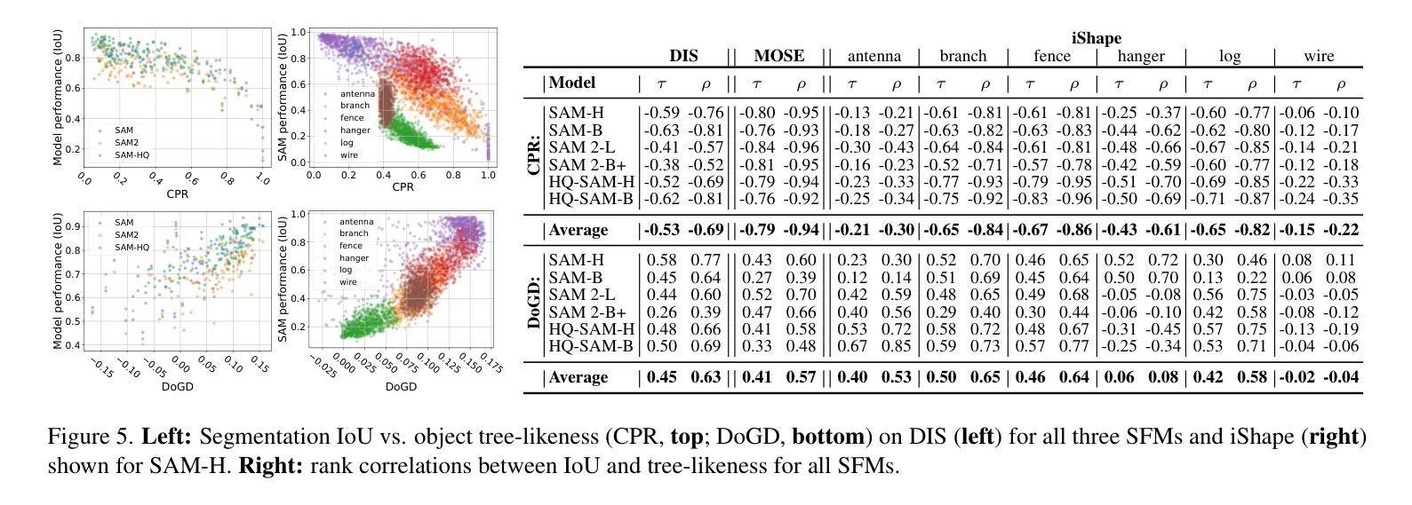 Summary:图像分割基础模型(SFMs)如Segment Anything Model(SAM)在跨域零样本和交互式分割方面取得了显著成果,但在处理具有特定结构的对象时存在局限性,特别是在处理具有密集树状形态和低纹理对比的对象时。本研究通过引入可解释的度量指标来量化对象树状形态和纹理分离程度,探讨了这一问题。研究结果表明,SFM性能与这些因素密切相关。这些问题是由于SFM误解局部结构为全局纹理而导致的过度分割或难以区分与相似背景的对象。