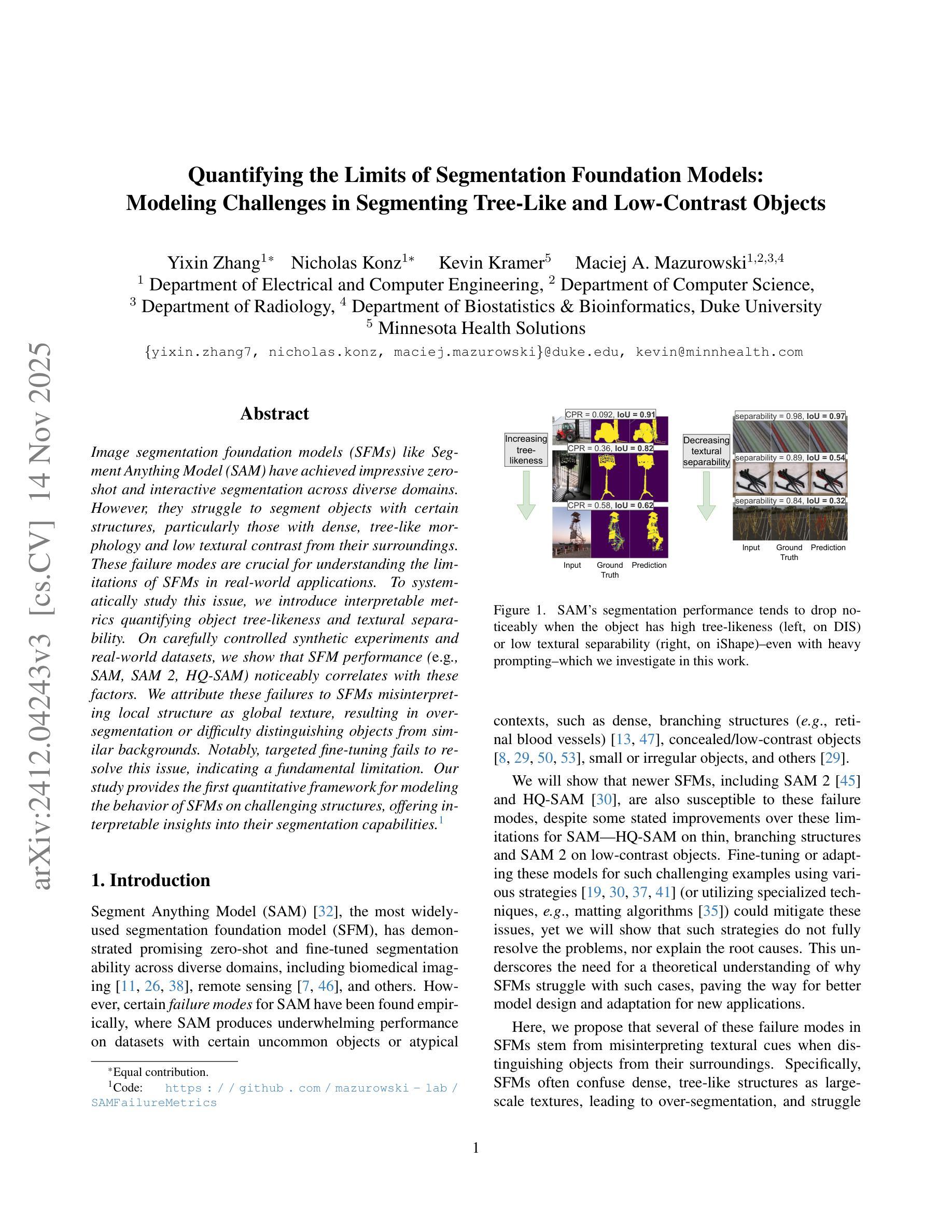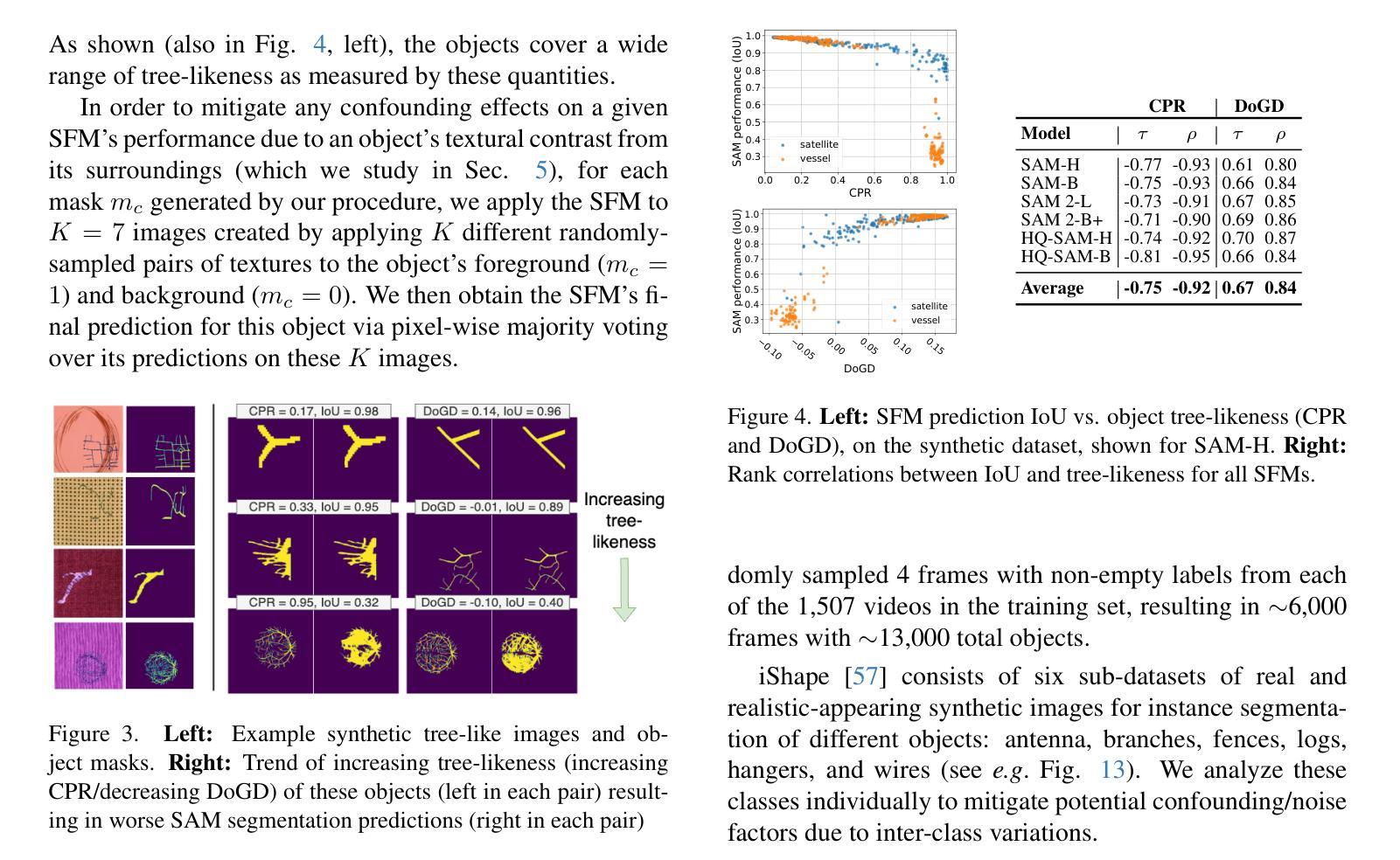 图像分割基础模型(SFMs),如任意分割模型(SAM),在不同领域实现了令人印象深刻的零样本和交互式分割。然而,它们在分割具有某些结构,特别是具有密集、树状形态以及与周围低纹理对比度的物体时遇到了困难。这些失败模式对于理解SFMs在现实世界应用中的局限性至关重要。为了系统地研究这个问题,我们引入了可解释的度量指标来量化对象树状程度和纹理可分离性。在精心控制的合成实验和真实世界数据集上,我们证明了SFM性能(例如SAM、SAM 2、HQ-SAM)与这些因素有明显的相关性。我们将这些失败归咎于SFMs误解了局部结构为全局纹理,导致过度分割或难以区分与类似背景的对象。值得注意的是,有针对性的微调未能解决这个问题,表明存在一个根本的局限性。我们的研究提供了针对具有挑战性结构的SFM行为的第一个定量框架,为他们的分割能力提供了可解释性的见解。