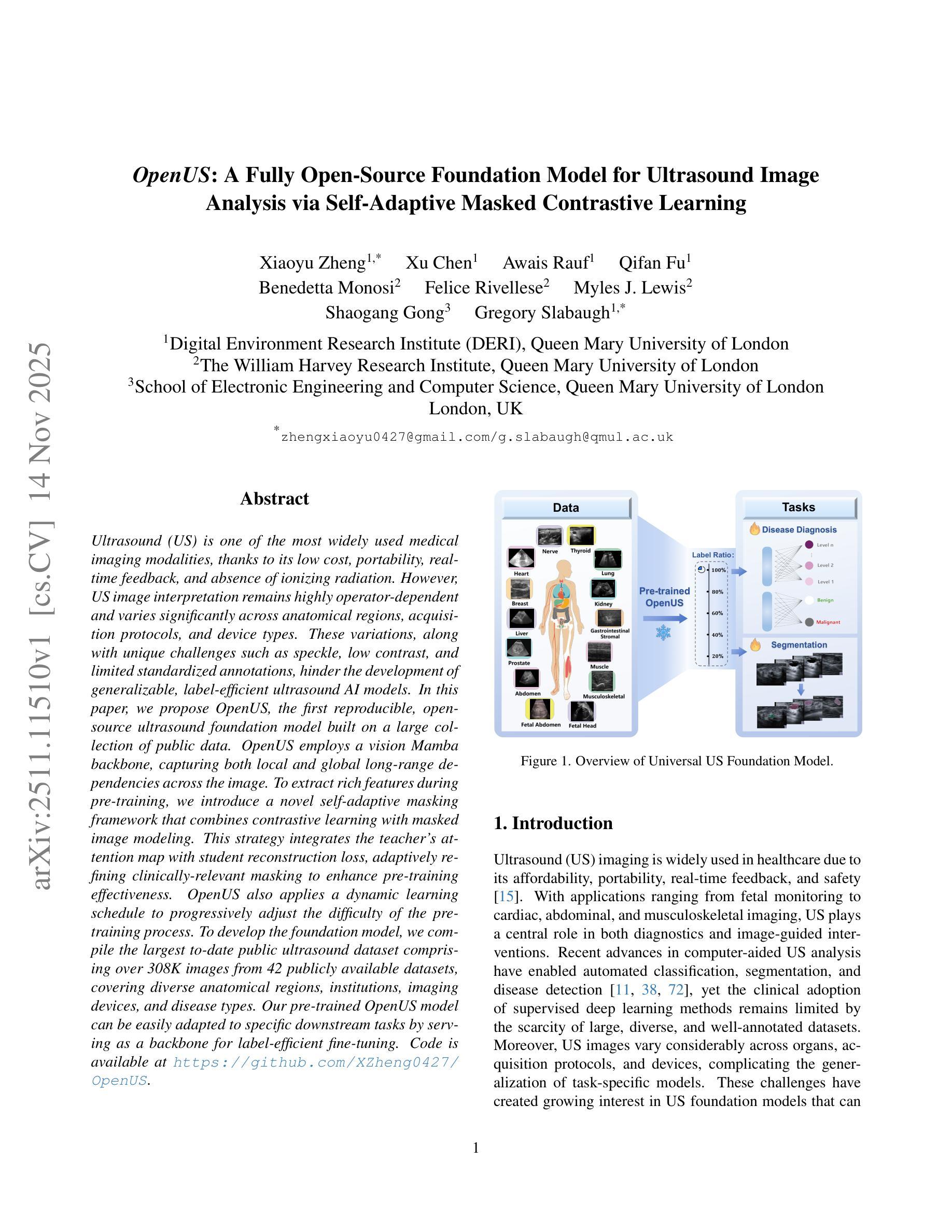 超声(US)是最广泛使用的医学成像方式之一,这得益于其成本低、便携、实时反馈以及没有电离辐射。然而,超声图像解读仍然高度依赖操作员,并在不同的解剖区域、采集协议和设备类型之间存在显著差异。这些差异,以及特有的挑战(如斑点噪声、低对比度和有限的标准化注释),阻碍了通用、标签高效的超声人工智能模型的发展。在本文中,我们提出了OpenUS,这是基于大量公共数据构建的开源超声基础模型的首次尝试。OpenUS采用视觉Mamba骨干网络,能够捕捉图像中的局部和全局远程依赖性关系。为了在预训练期间提取丰富的特征,我们引入了一种新型自适应掩码框架,该框架结合了对比学习与掩码图像建模。该策略将教师的注意力图与学生重建损失相结合,自适应地细化与临床相关的掩码,以提高预训练的有效性。OpenUS还采用动态学习时间表来逐步调整预训练过程的难度。为了开发基础模型,我们编译了迄今为止最大的公共超声数据集,包含超过30.8万张图像,来自42个公开可用数据集,涵盖多种解剖区域、机构、成像设备和疾病类型。我们的预训练OpenUS模型可以很容易地适应特定的下游任务,作为标签高效微调的主干。代码可访问于 https://github.com/XZheng0427/OpenUS。