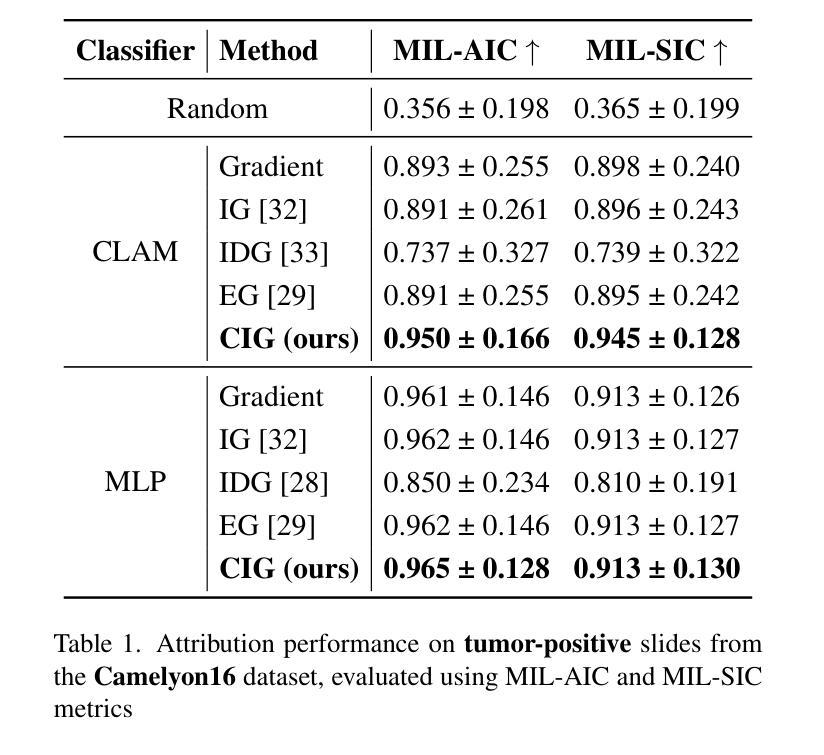 - 实验结果表明,CIG在多种癌症类型的数据集上表现优异,生成的归属图能紧密对齐真实肿瘤区域。