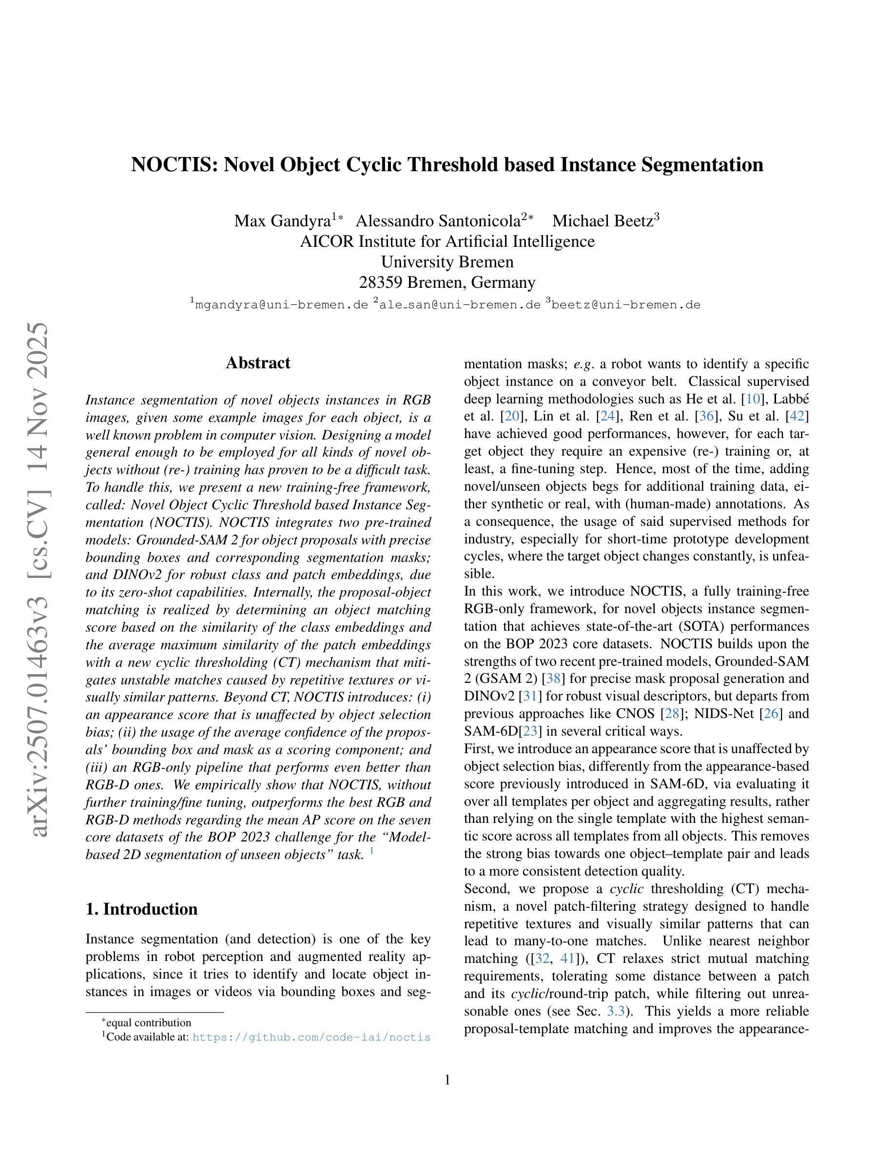 在RGB图像中对新型对象实例进行实例分割,给定每个对象的示例图像,这是计算机视觉领域的一个知名问题。设计一种通用模型,能够应用于各种新型对象而无需(重新)训练,已被证明是一项艰巨的任务。为了处理这个问题,我们提出了一种新的无训练框架,称为:基于循环阈值的新型对象实例分割(NOCTIS)。NOCTIS整合了两个预训练模型:用于生成带有精确边界框和相应分割掩码的提案的Grounded-SAM 2;以及具有零样本能力的DINOv2,用于生成稳健的类别和补丁嵌入。在内部,通过基于类别嵌入的相似性以及补丁嵌入与新的循环阈值(CT)机制的最大平均相似性的确定来实现提案对象匹配,该CT机制减轻了由重复纹理或视觉相似模式引起的不稳定匹配。除了CT之外,NOCTIS还引入了:(i)一种不受对象选择偏见影响的外观评分;(ii)使用提案的边界框和掩码的平均置信度作为评分组成部分;(iii)仅使用RGB的管道,其性能甚至超过了RGB-D管道。我们通过实验证明,NOCTIS无需进一步的训练或微调,在BOP 2023挑战的七个核心数据集上的“未见对象的基于模型的二维分割”任务的平均AP得分方面,超过了最佳的RGB和RGB-D方法。