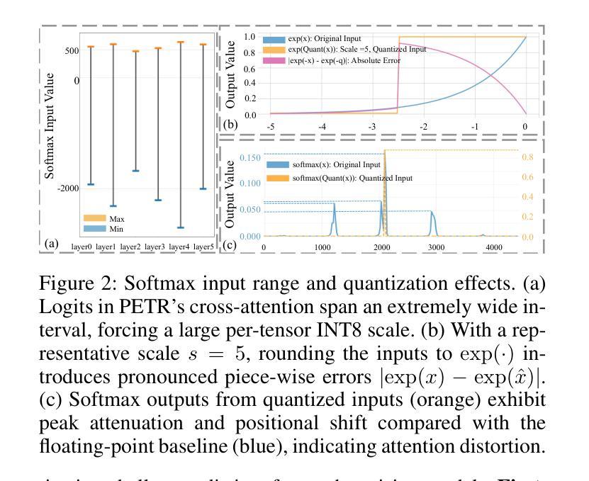 基于摄像头的多视角3D检测对于自动驾驶至关重要。PETR及其变体(PETRs)在基准测试中表现优异,但由于计算成本高和内存占用大,面临着部署挑战。量化是一种通过降低权重和激活的位宽来压缩深度神经网络的有效技术。然而,直接将现有量化方法应用于PETRs会导致精度严重下降。这个问题主要源于两个关键挑战:(1)多模态特征之间幅度差异显著,特别是图像特征和相机射线位置嵌入(PE);(2)量化非线性算子效率低下和近似误差,这通常依赖于硬件不友好的计算。在本文中,我们提出了FQ-PETR,这是一个针对PETRs的全量化框架,具有三个关键创新点:(1)量化友好的激光雷达射线位置嵌入(QFPE):用激光雷达先验引导的单点采样和基于锚点的嵌入替换多点采样,消除了问题非线性(例如,反sigmoid),并使PE尺度与图像特征对齐,保留精度。(2)双查找表(DULUT):该算法使用两个级联的线性LUT来近似复杂的非线性函数,以最小的条目实现高保真,无需专用硬件。(3)数值稳定后进行量化(QANS):在softmax数值稳定后进行量化,减轻了大输入导致的注意力失真。在PETRs(例如PETR、StreamPETR、PETRv2、MV2d上),FQ-PETR在W8A8下实现了接近浮点精度(1%的降级),同时延迟降低了高达75%,显著优于现有的PTQ和QAT基线。
