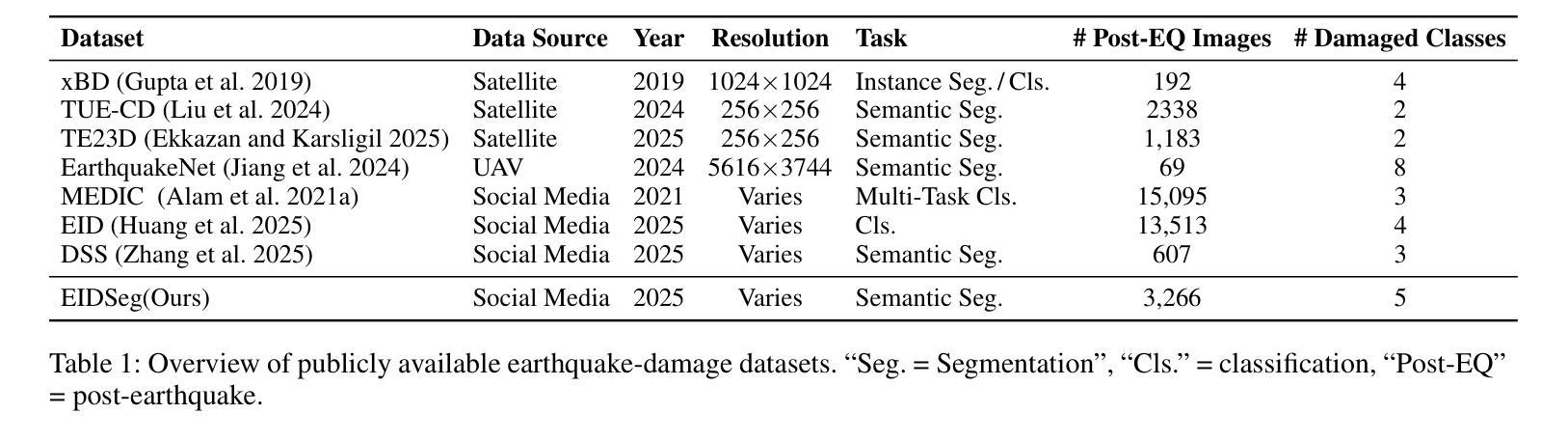 - 引入EIDSeg数据集,专为灾后社交媒体影像设计的大规模语义分割数据集。