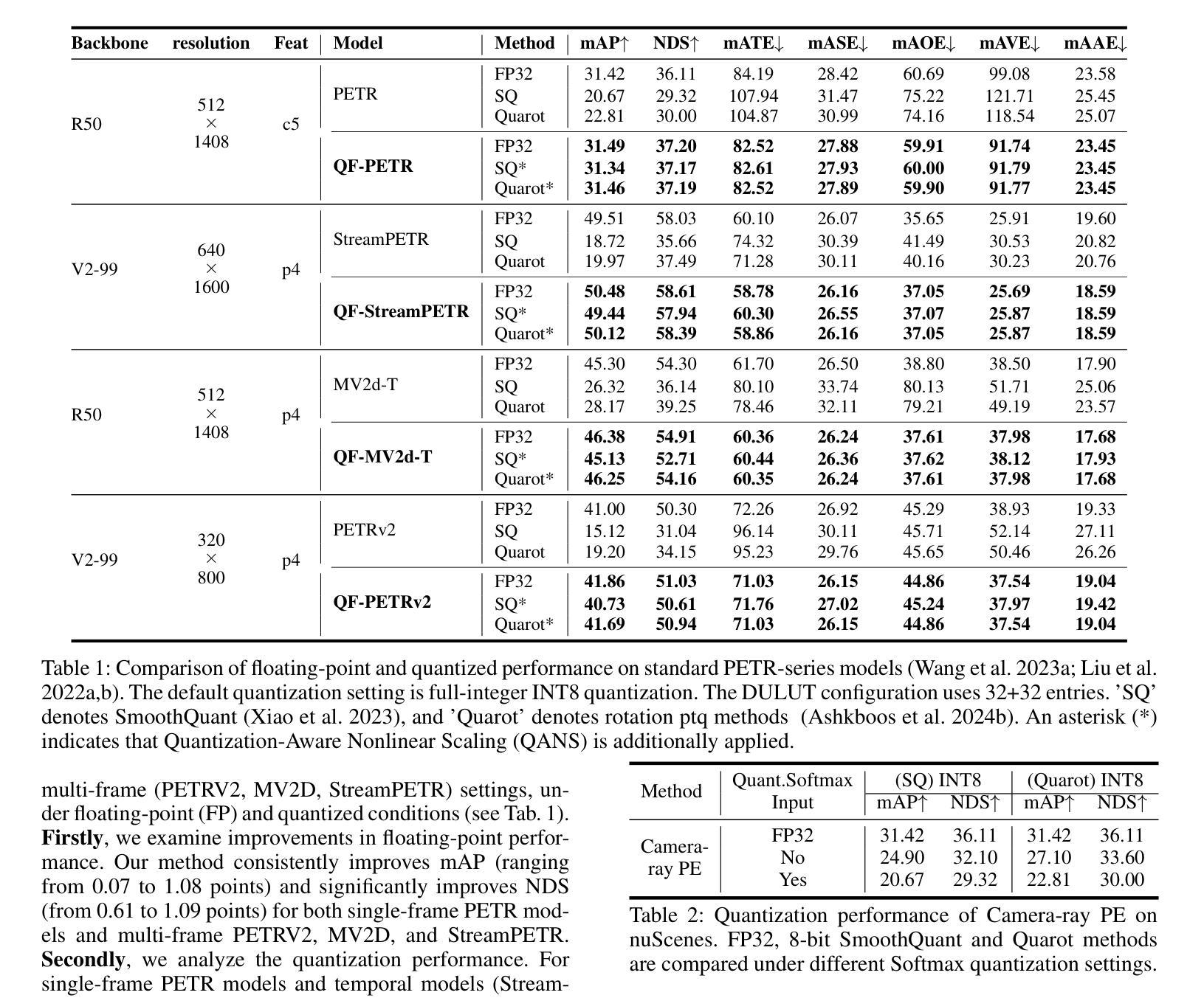 - FQ-PETR框架包含三项关键创新:Quantization-Friendly LiDAR-ray Position Embedding(QFPE)、Dual-Lookup Table(DULUT)和Quantization After Numerical Stabilization(QANS)。