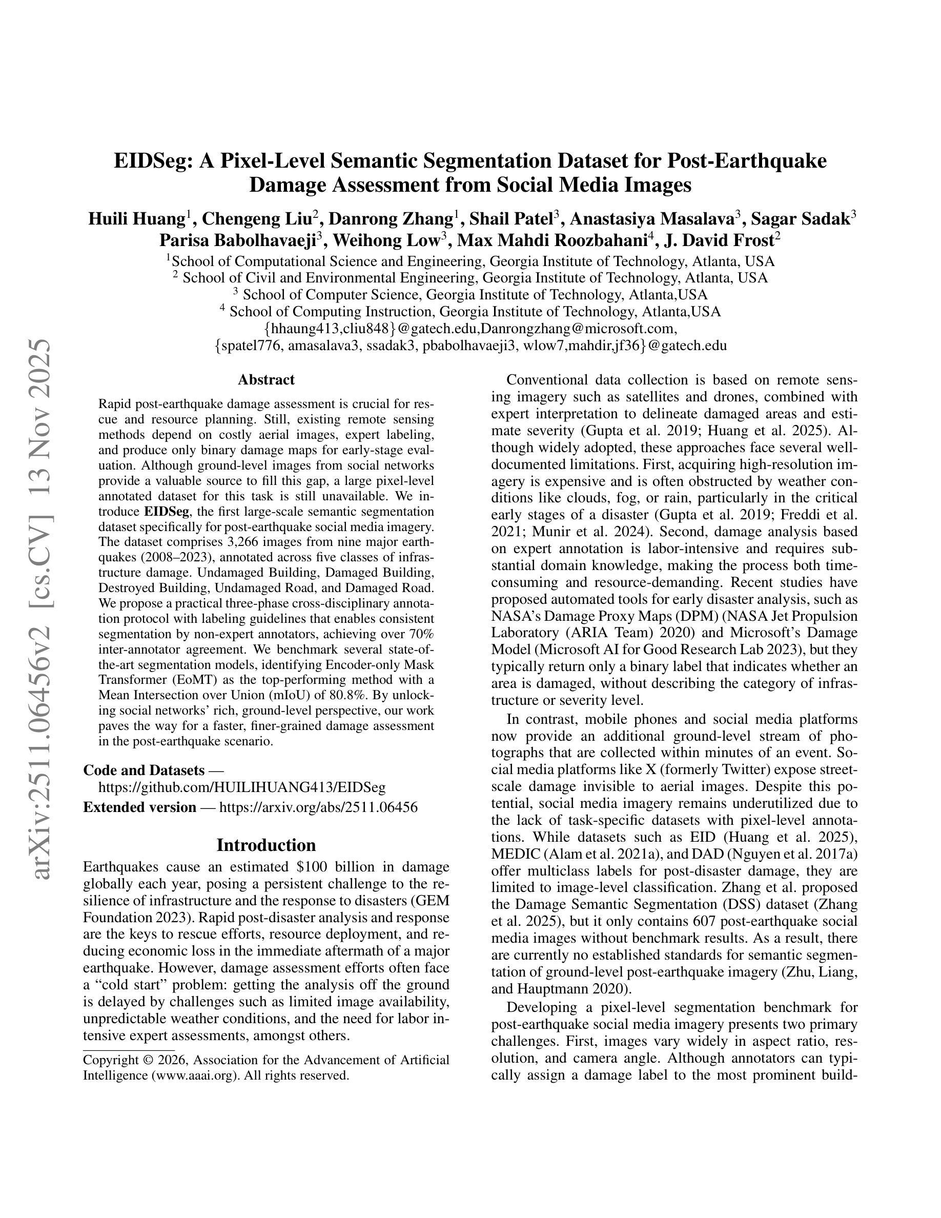 本文介绍了针对灾后社交媒体影像的语义分割数据集EIDSeg。该数据集包含来自九个主要地震的3,266张图像,涵盖五种基础设施损坏类别。提出实用的三阶段跨学科标注协议,使非专家标注者能够进行一致分割,实现超过70%的标注者间一致性。同时,对最先进的分割模型进行基准测试,发现Encoder-only Mask Transformer表现最佳,Mean Intersection over Union (mIoU)达到80.8%。本文利用社交媒体丰富的地面视角,为灾后场景实现更快、更精细的损害评估铺平了道路。