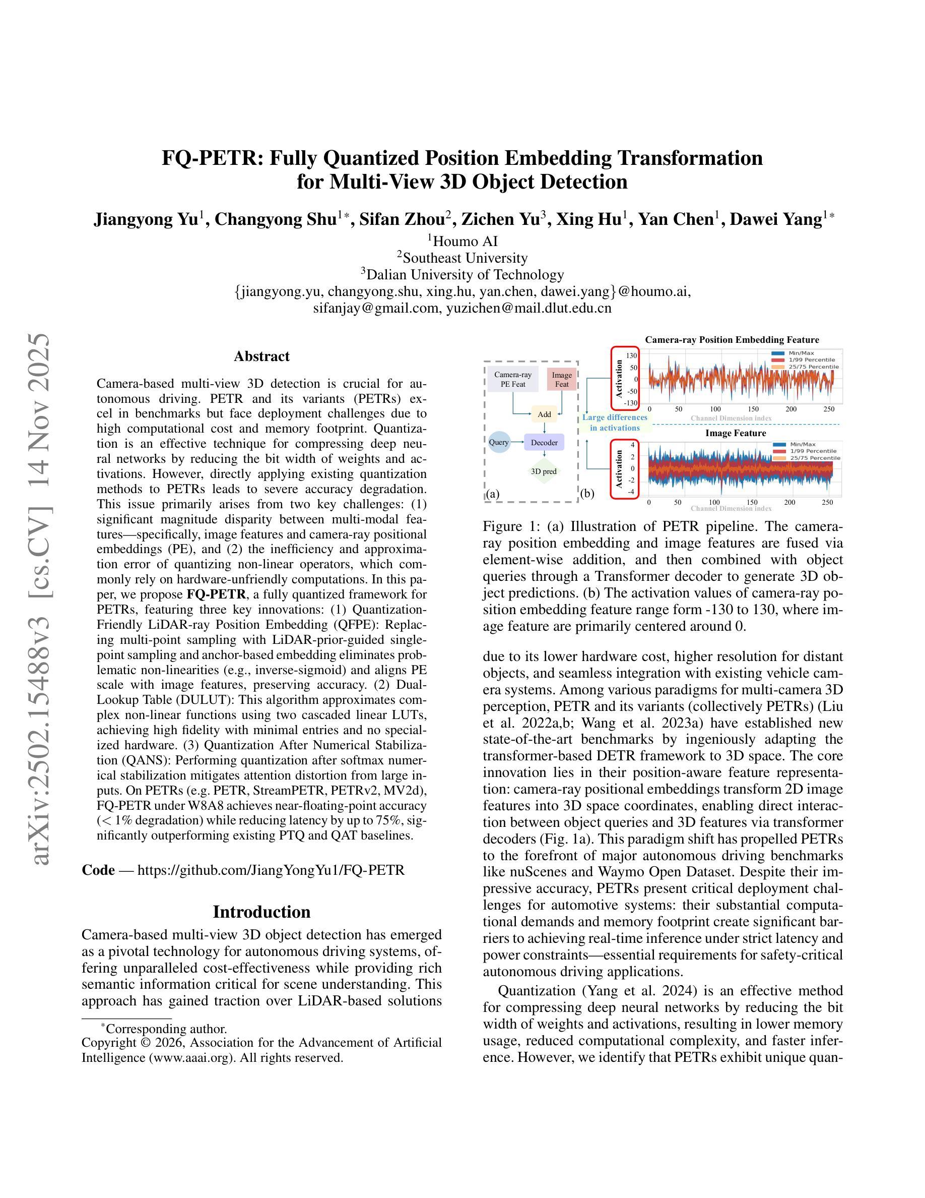 针对自动驾驶中的多视角三维检测,PETR及其变体面临高计算成本和内存占用问题,本文提出FQ-PETR框架,通过三项创新技术实现高效量化,在保持精度接近浮点精度的同时,降低了延迟。