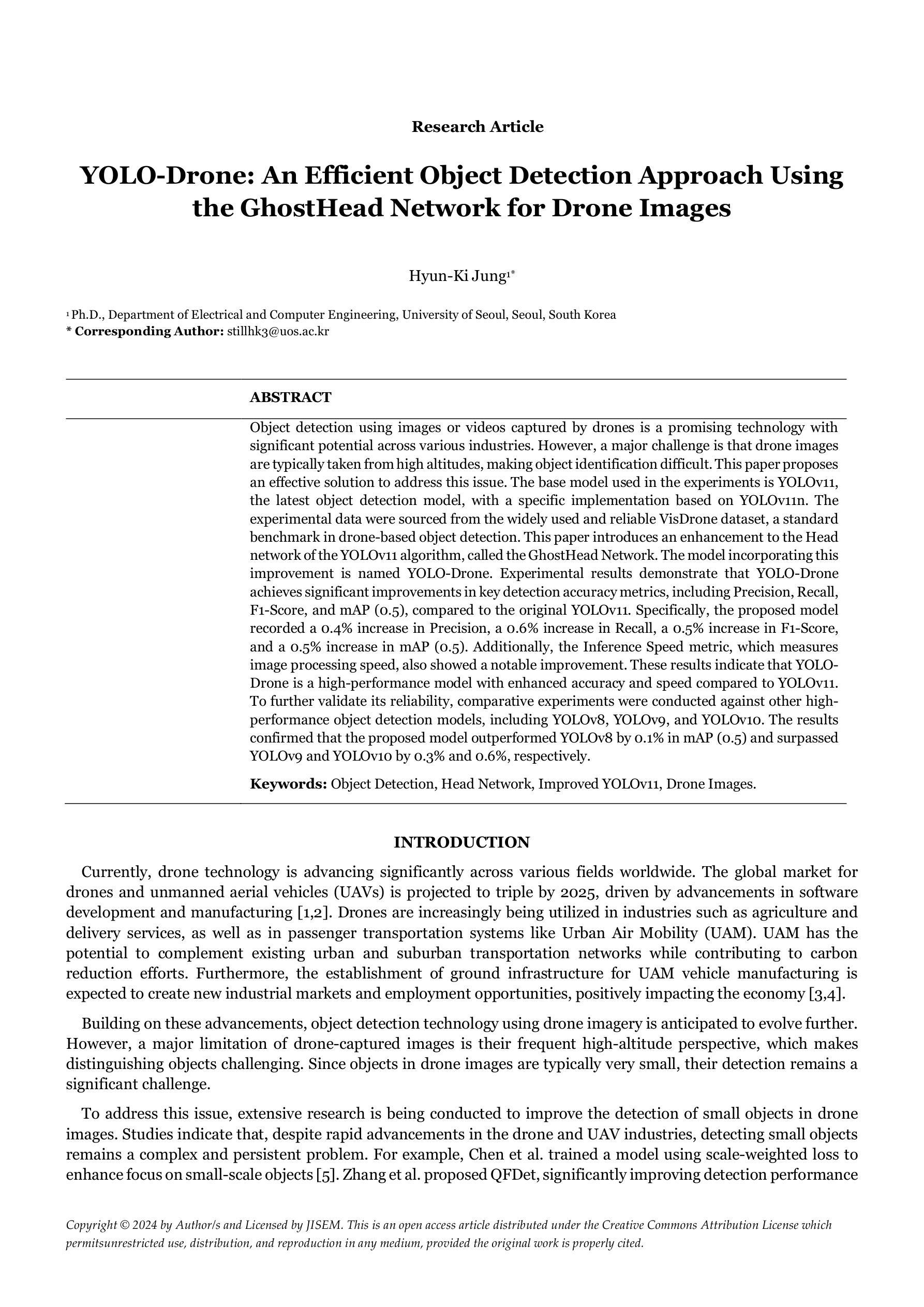 使用无人机捕获的图像或视频进行物体检测是一项在不同行业具有巨大潜力的有前途的技术。然而,一个主要挑战是无人机图像通常是从高空拍摄的,这使得物体识别变得困难。本文针对这一问题提出了一种有效的解决方案。实验所用的基础模型是YOLOv11(最新的物体检测模型),并结合YOLOv11n进行了特定实现。实验数据来自广泛使用和可靠的VisDrone数据集,这是无人机物体检测的标准基准数据集。本文对YOLOv11算法的Head网络进行了一项改进,称为GhostHead网络。结合了这种改进的模型被称为YOLO-Drone。实验结果表明,与原始的YOLOv11相比,YOLO-Drone在关键的检测精度指标上取得了显著的提升,包括精确度、召回率、F1分数和mAP(0.5)。具体来说,所提出的模型在精确度上提高了0.4%,在召回率上提高了0.6%,在F1分数上提高了0.5%,在mAP(0.5)上提高了0.5%。此外,衡量图像处理速度的推理速度指标也显示出明显的改进。这些结果表明,YOLO-Drone是一个与YOLOv11相比具有增强精度和速度的高性能模型。为了进一步验证其可靠性,还与其他高性能物体检测模型(包括YOLOv8、YOLOv9和YOLOv10)进行了对比实验。结果证实,所提出的模型在mAP(0.5)上比YOLOv8高出0.1%,并分别比YOLOv9和YOLOv10高出0.3%和0.6%。