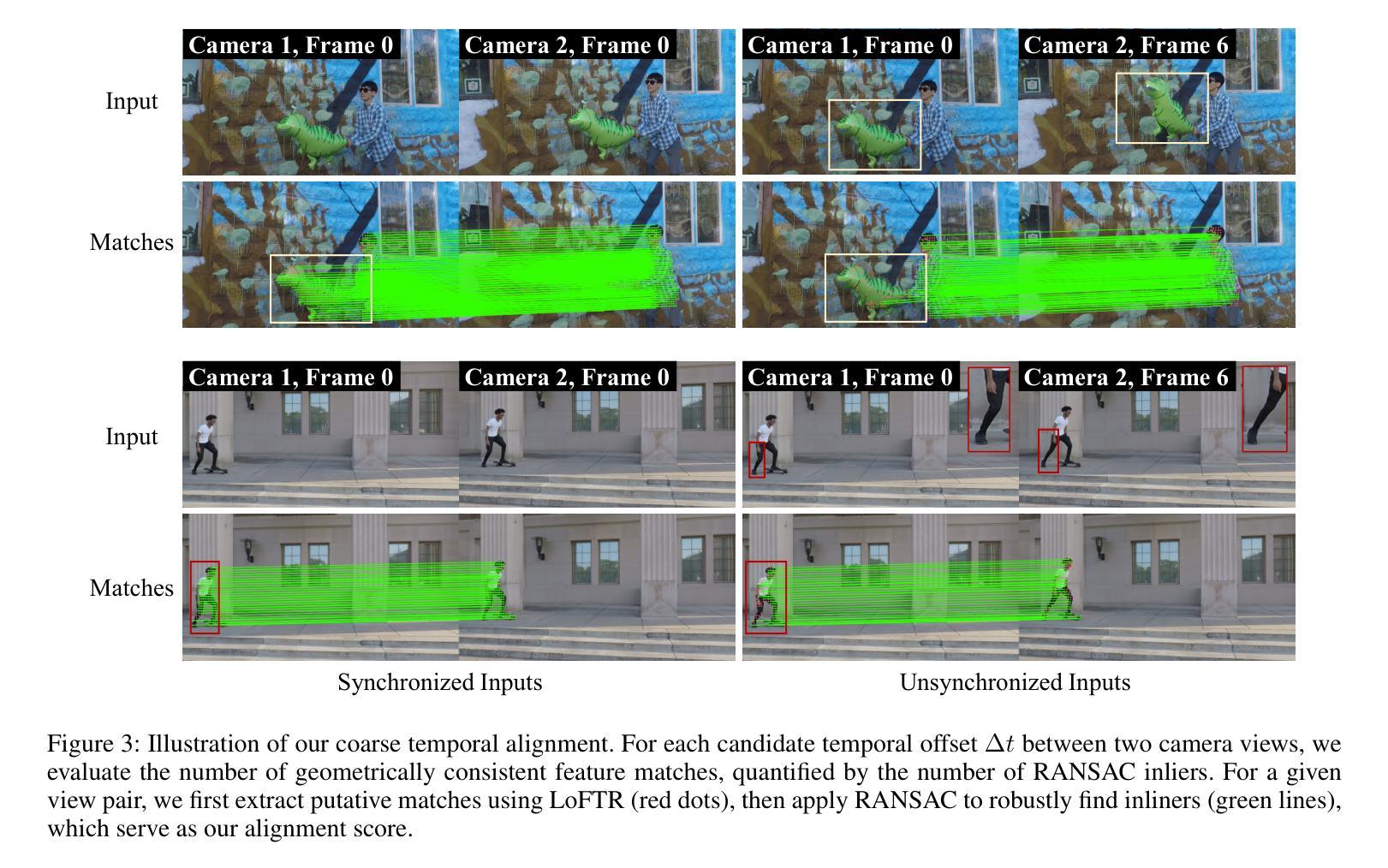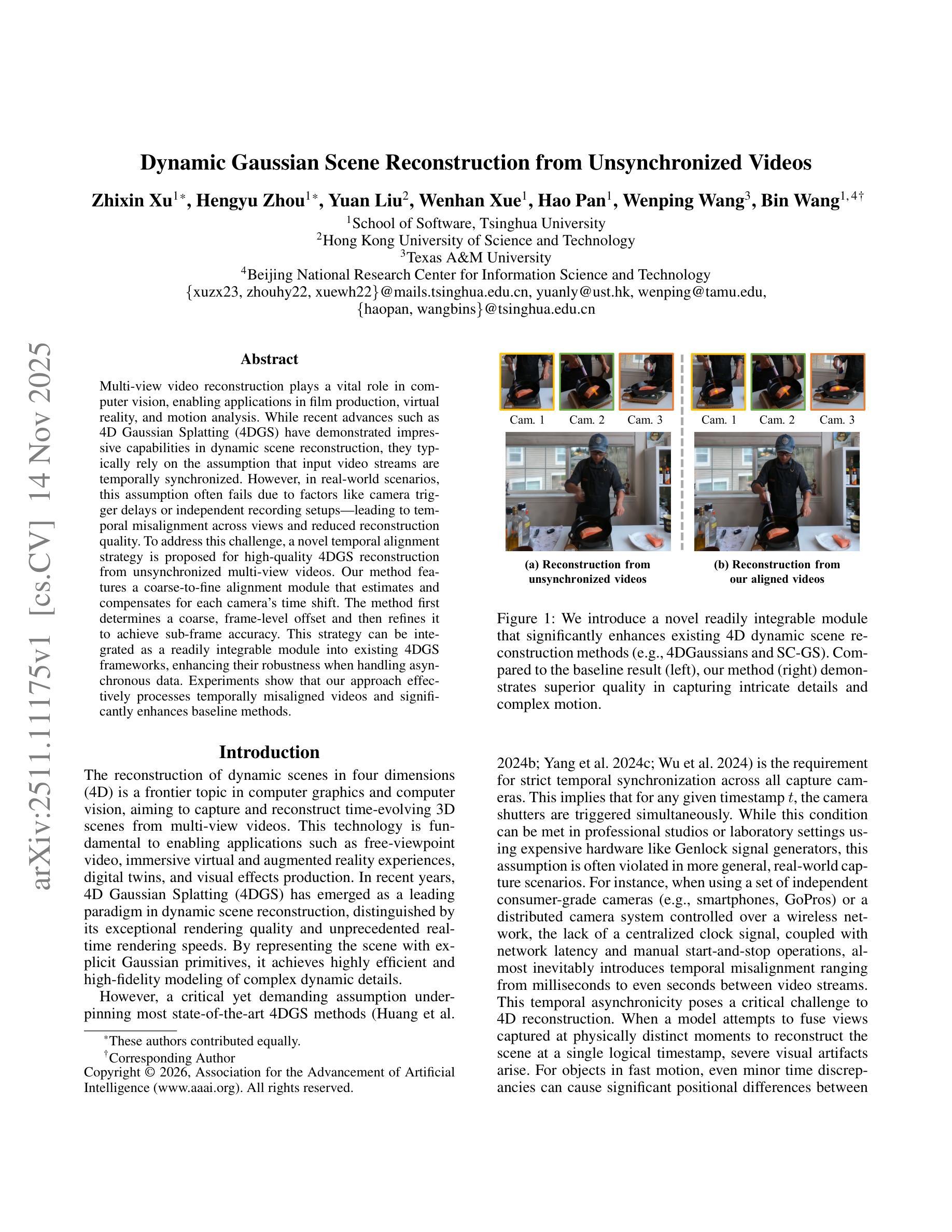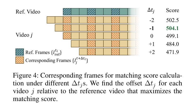 多视角视频重建在计算机视觉中扮演着至关重要的角色,广泛应用于电影制作、虚拟现实和运动分析。虽然最近的进展,如四维高斯散斑(4DGS),在动态场景重建中表现出了令人印象深刻的能力,但它们通常依赖于输入视频流在时间上是同步的这一假设。然而,在现实场景中,由于摄像机触发延迟或独立记录设置等因素,这一假设往往不成立,导致跨视图的时序不对齐和重建质量下降。为了解决这一挑战,提出了一种用于从异步多视角视频中实现高质量4DGS重建的新型时间对齐策略。我们的方法采用了从粗到细的对齐模块,估计并补偿了每个摄像机的时间偏移。该方法首先确定一个粗略的帧级偏移,然后对其进行细化,以达到亚帧精度。该策略可以作为一个可轻松集成的模块,集成到现有的4DGS框架中,增强其在处理异步数据时的稳健性。实验表明,我们的方法能够有效地处理时序不对齐的视频,并显著提高基线方法的性能。