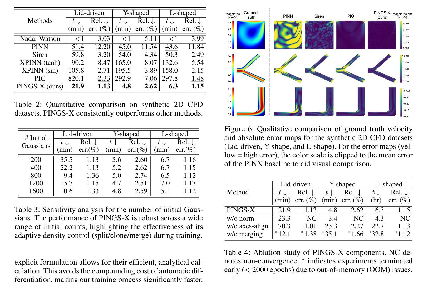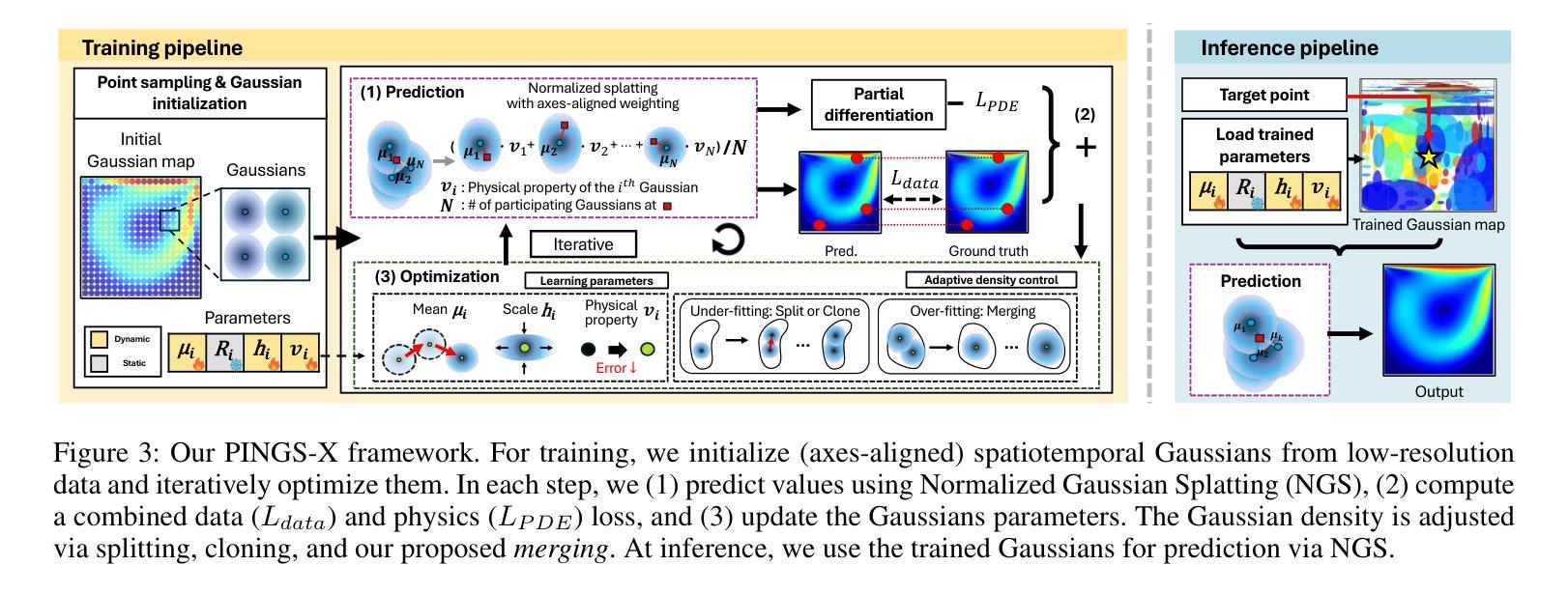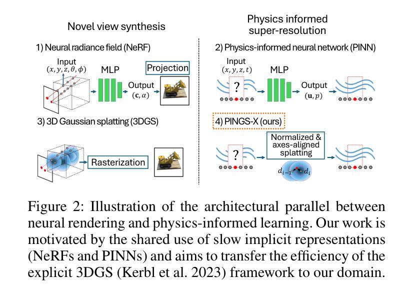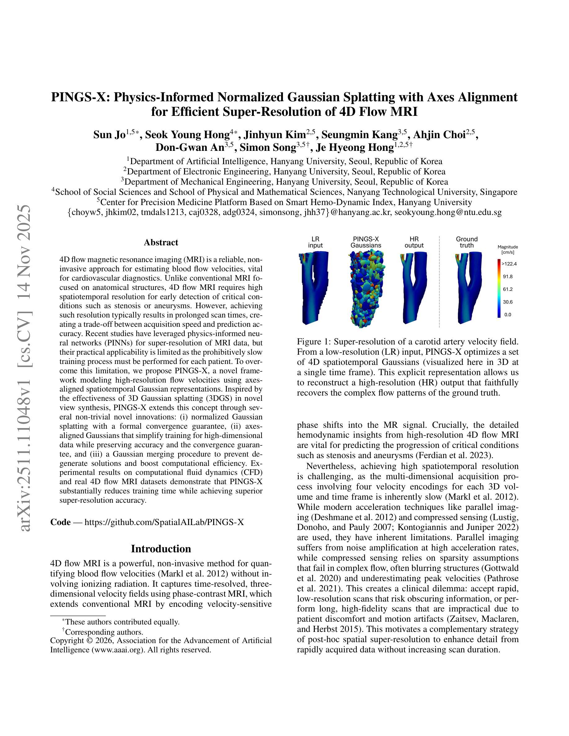 4D流磁共振成像(MRI)用于估计血流速度,对心血管疾病诊断至关重要。传统MRI关注于解剖结构,而4D流MRI要求高时空分辨率以早期检测狭窄或动脉瘤等关键状况。研究利用物理信息神经网络(PINNs)实现MRI数据的超分辨率,但每个患者的训练过程极其缓慢。为解决这一问题,本文提出PINGS-X框架,采用轴对齐时空高斯表示模拟高分辨率血流速度。受3D高斯喷涂(3DGS)在新型视图合成中的有效性启发,PINGS-X通过几个重大创新扩展了这一理念:正规化高斯喷涂、确保收敛性;轴对齐高斯简化高维数据的训练并保留准确性和收敛保证;以及高斯合并程序防止退化解决方案并提高计算效率。实验结果表明,PINGS-X在减少训练时间的同时实现了出色的超分辨率准确性。