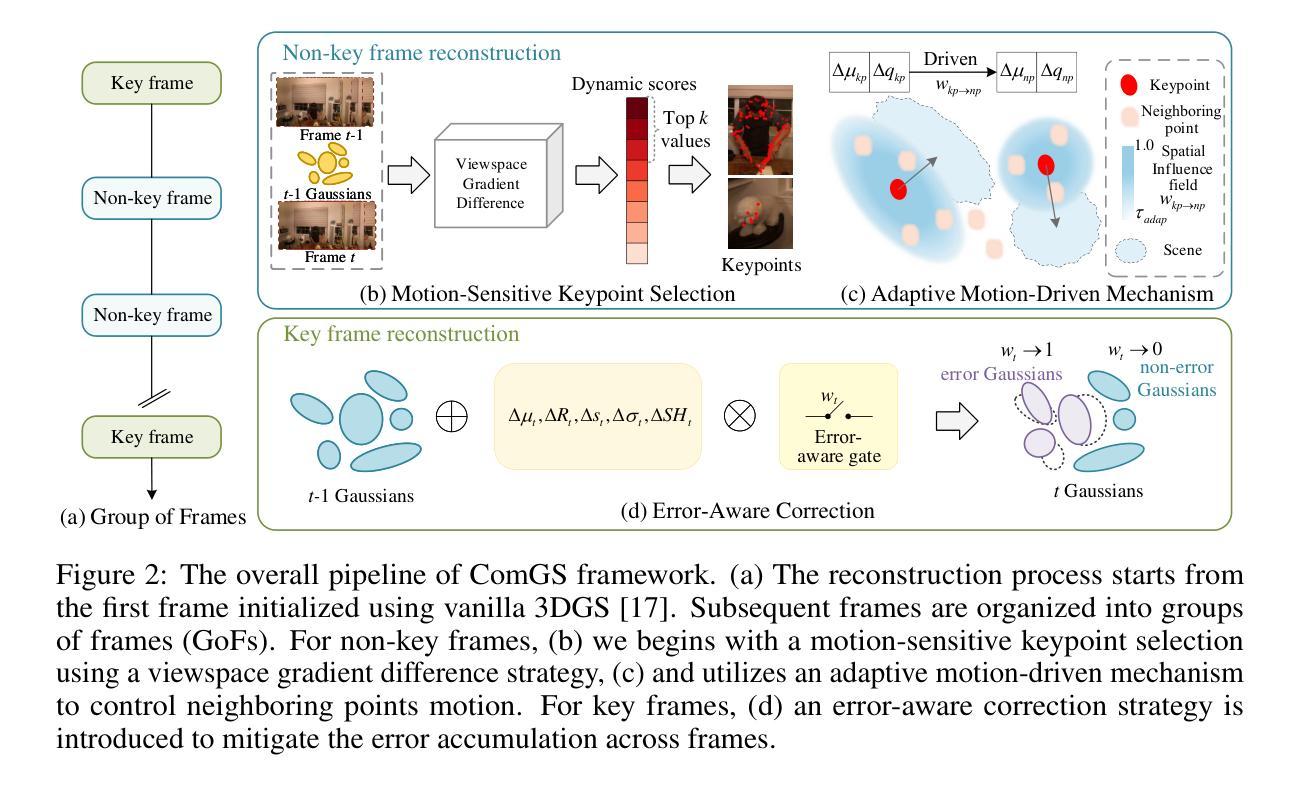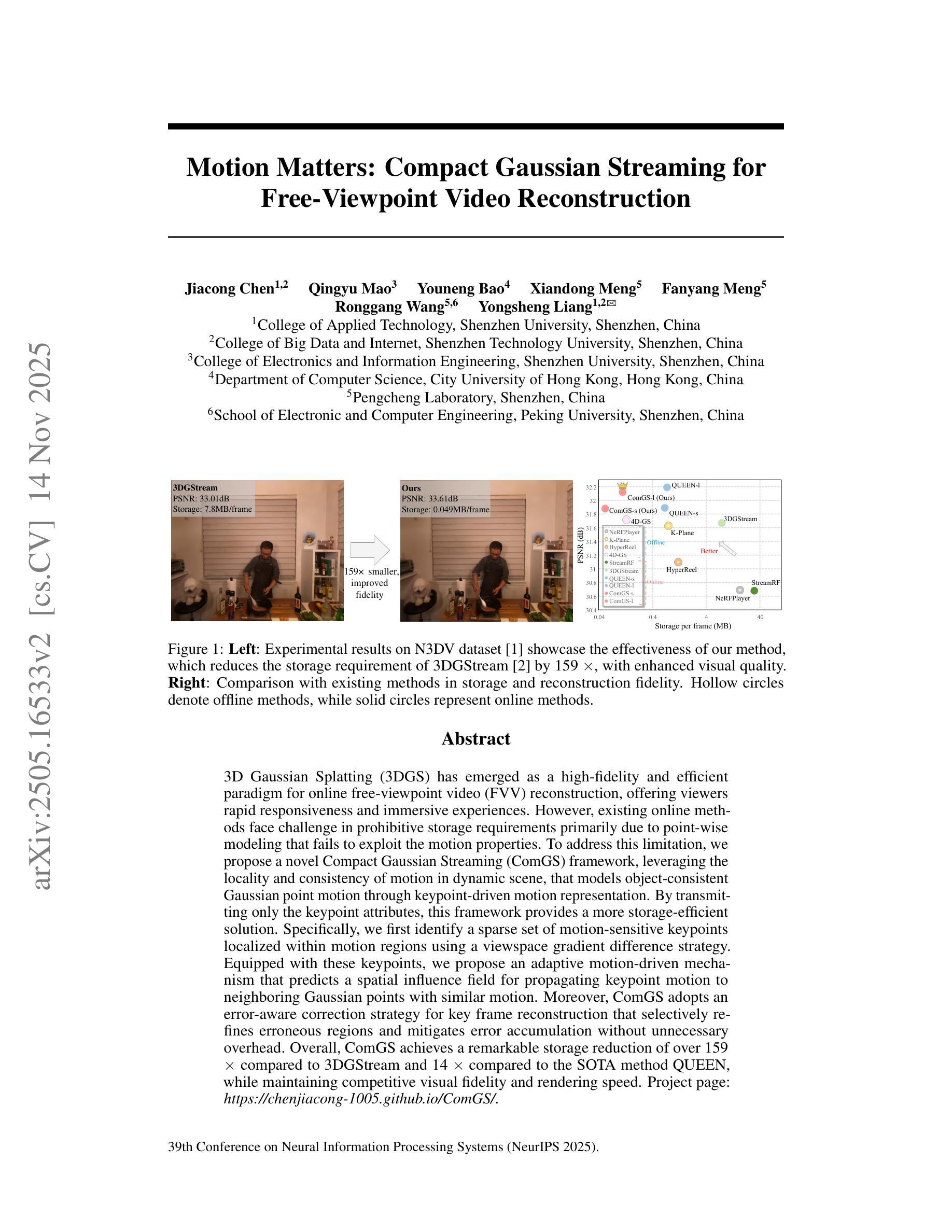 3DGS技术在在线自由视点视频重建领域具有高保真度和高效率的优势。然而,由于点建模方法未充分利用运动属性,现有在线方法存在存储要求过高的挑战。为解决此问题,提出一种新型的Compact Gaussian Streaming(ComGS)框架,利用动态场景中的运动局部性和一致性,通过关键帧驱动的运动表示对物体一致的高斯点运动进行建模。仅传输关键帧属性,为更高效的存储解决方案。ComGS采用误差感知校正策略,选择性优化错误区域,减轻误差累积,同时保持视觉保真度和渲染速度。